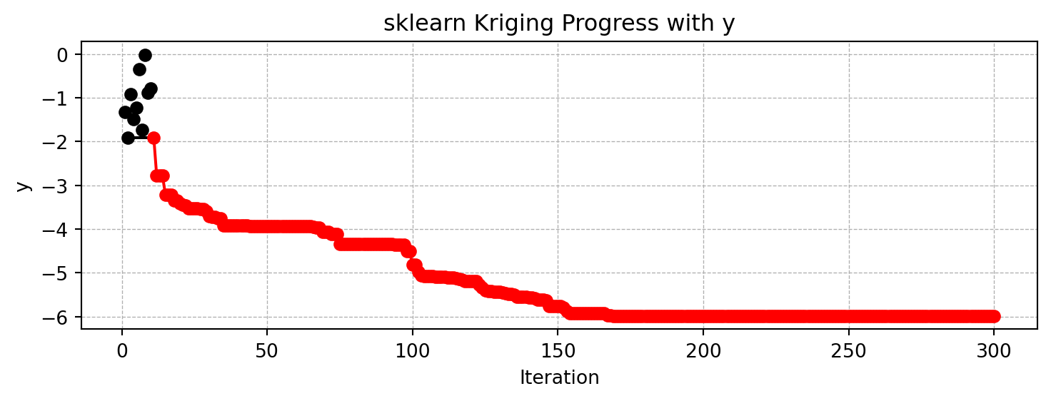 print(f"[10D] Kriging y: min y = {S_micha.min_y:.4f} at x = {S_micha.min_X}")[10D] Kriging y: min y = -5.9887 at x = [2.20081795 2.71163367 2.21906084 2.48190887 2.62732398 1.89634636