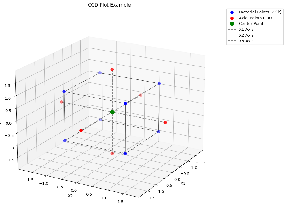 | title | str | Title of the plot. Defaults to “Central Composite Design (CCD) for k=3”. | 'Central Composite Design (CCD) for k=3' |