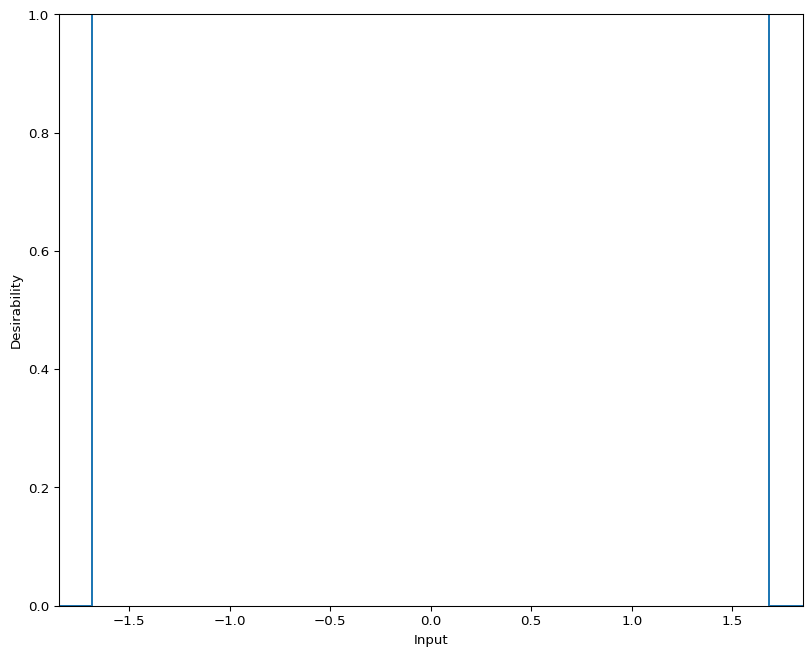 from spotdesirability import DBoximport numpy as npimport matplotlib.pyplot as plt# Create a DBox objectdbox = DBox(low=-1.682, high=1.682)# Predict desirability for a range of inputsinputs = np.array([-3, -1.682, 0, 1.682, 3])desirability = dbox.predict(inputs)print(desirability)# [0. 1. 1. 1. 0.]# Plot the desirability functiondbox.plot()