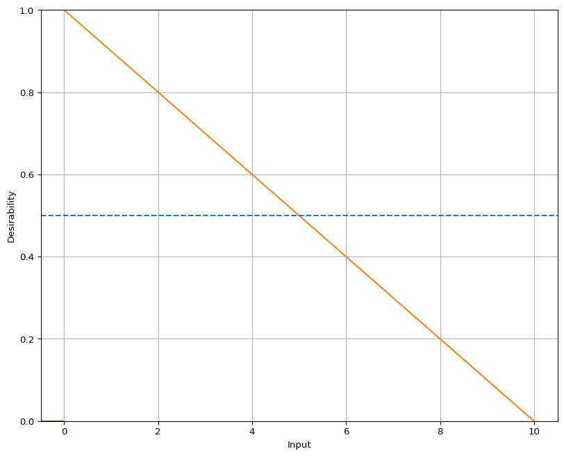 from spotdesirability import DMinimport numpy as npimport matplotlib.pyplot as plt# Create a DMin objectdmin = DMin(low=0, high=10, scale=1)# Predict desirability for a range of inputsinputs = np.array([-5, 0, 5, 10, 15])desirability = dmin.predict(inputs)print(desirability)# [1. 1. 0.5 0. 0.]# Plot the desirability functiondmin.plot()