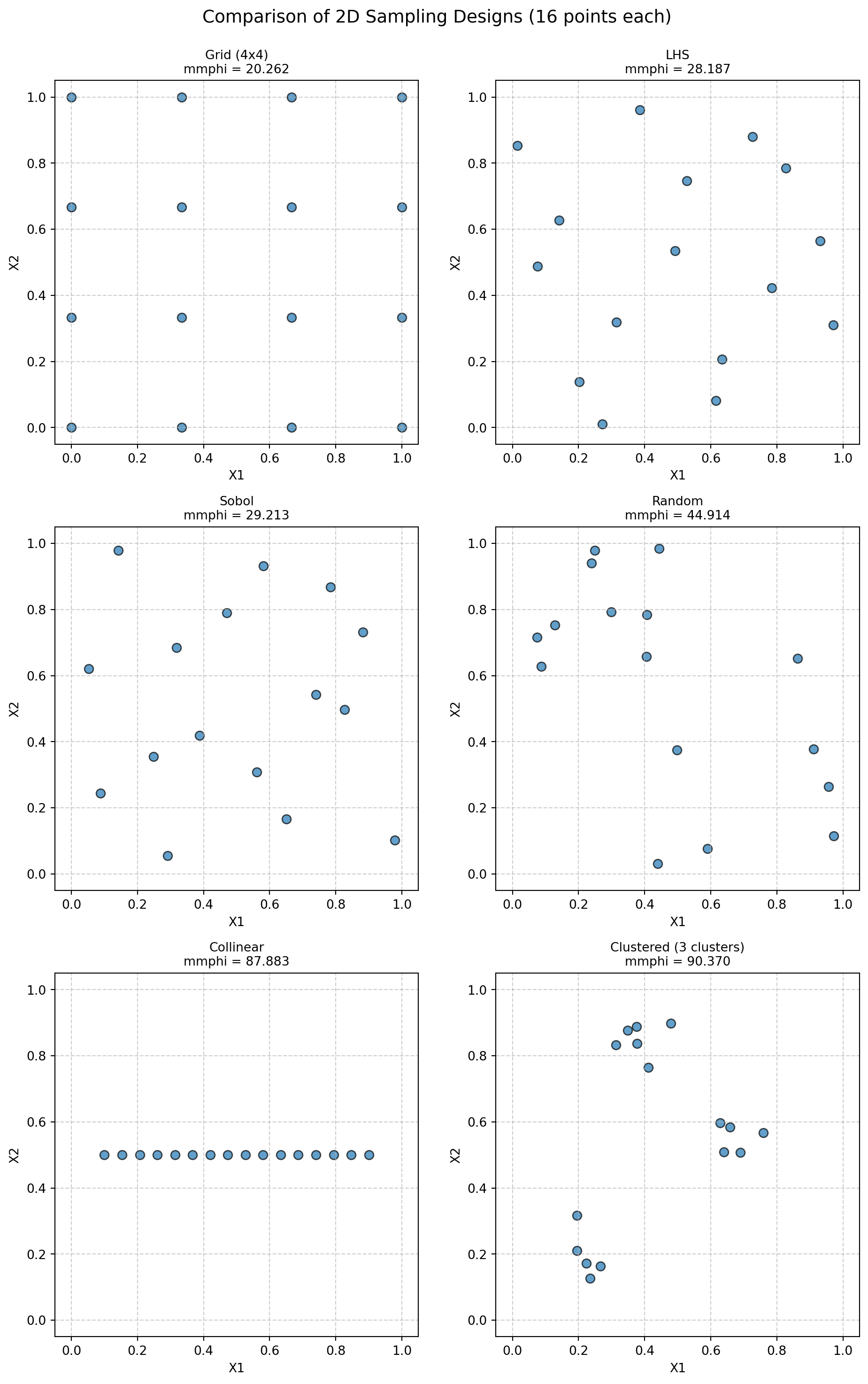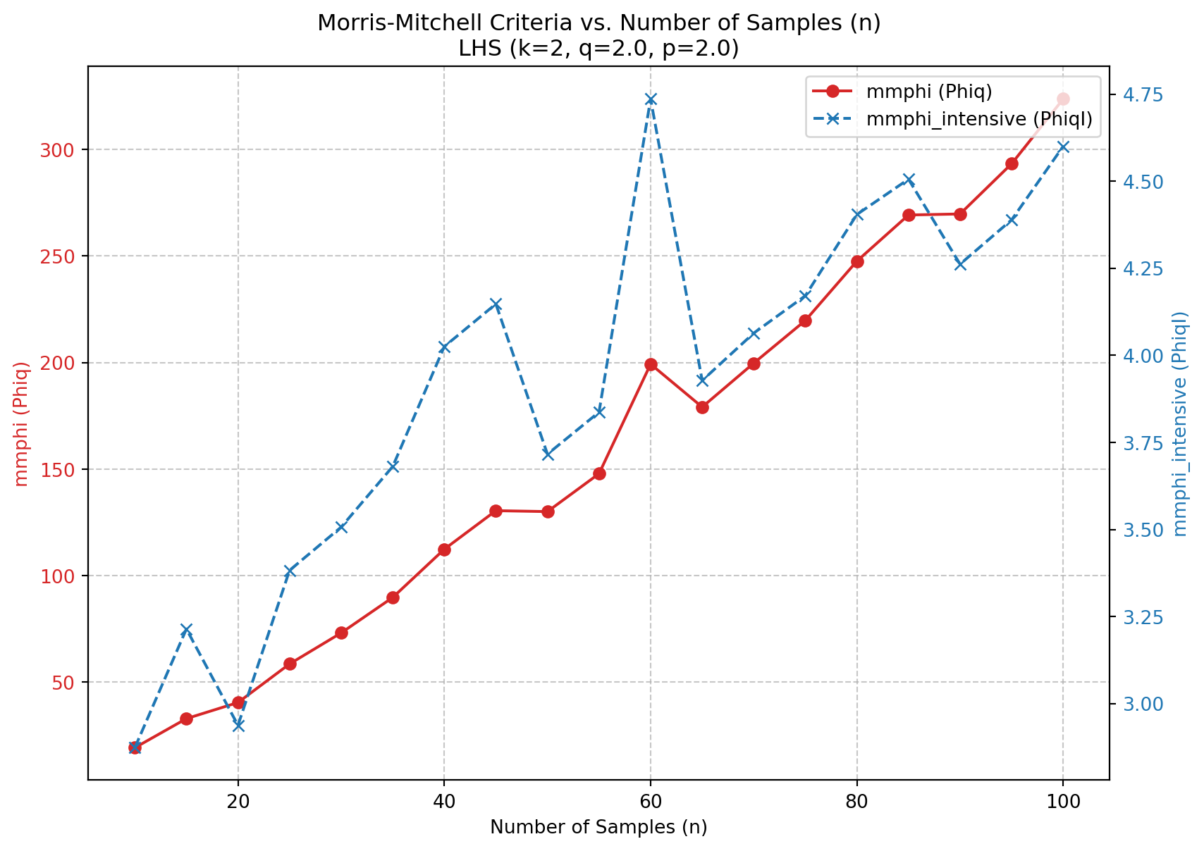Figure 27.11 shows the comparison of the two Morris-Mitchell criteria for different sample sizes using the plot_mmphi_vs_n_lhs function. The red line represents the standard Morris-Mitchell criterion, while the blue line represents the sample-size invariant version. Note the difference in the y-axis scales, which highlights how the sample-size invariant version remains consistent across varying sample sizes.