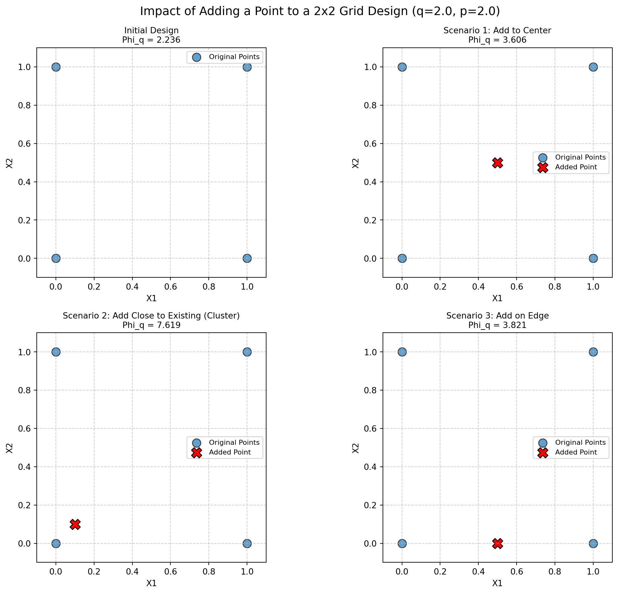 plt.suptitle(f"Impact of Adding a Point to a 2x2 Grid Design (q={q}, p={p})", fontsize=14)