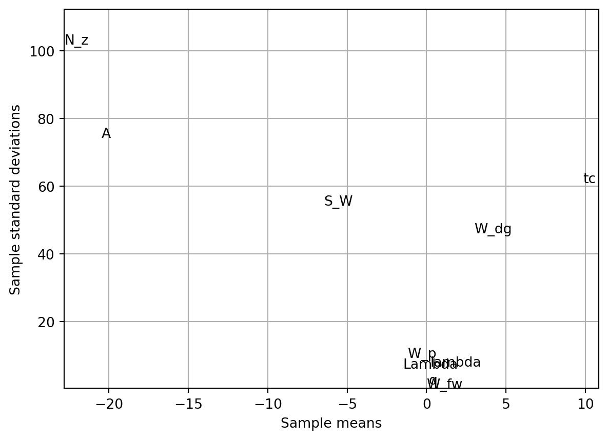 Morris’s method aims to estimate the parameters of the distribution of elementary effects associated with each variable. A large measure of central tendency indicates that a variable has a significant influence on the objective function across the design space, while a large measure of spread suggests that the variable is involved in interactions or contributes to the nonlinearity of \(f\). In practice, the sample mean and standard deviation of a set of \(d_i(x)\) values, calculated in different parts of the design space, are used for this estimation.