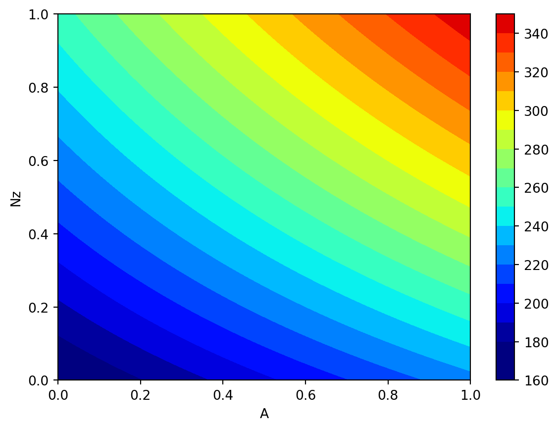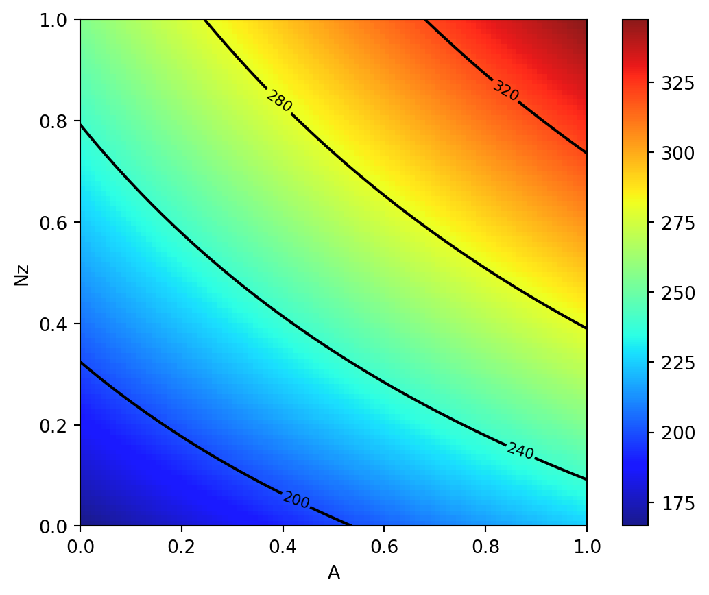 - The figure displays the weight response as a function of two variables, \(N_z\) and \(A\), using an image-contour plot.