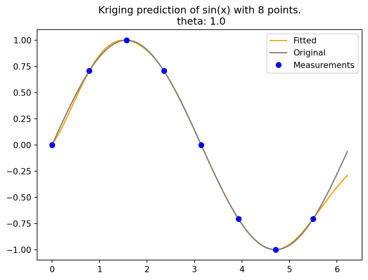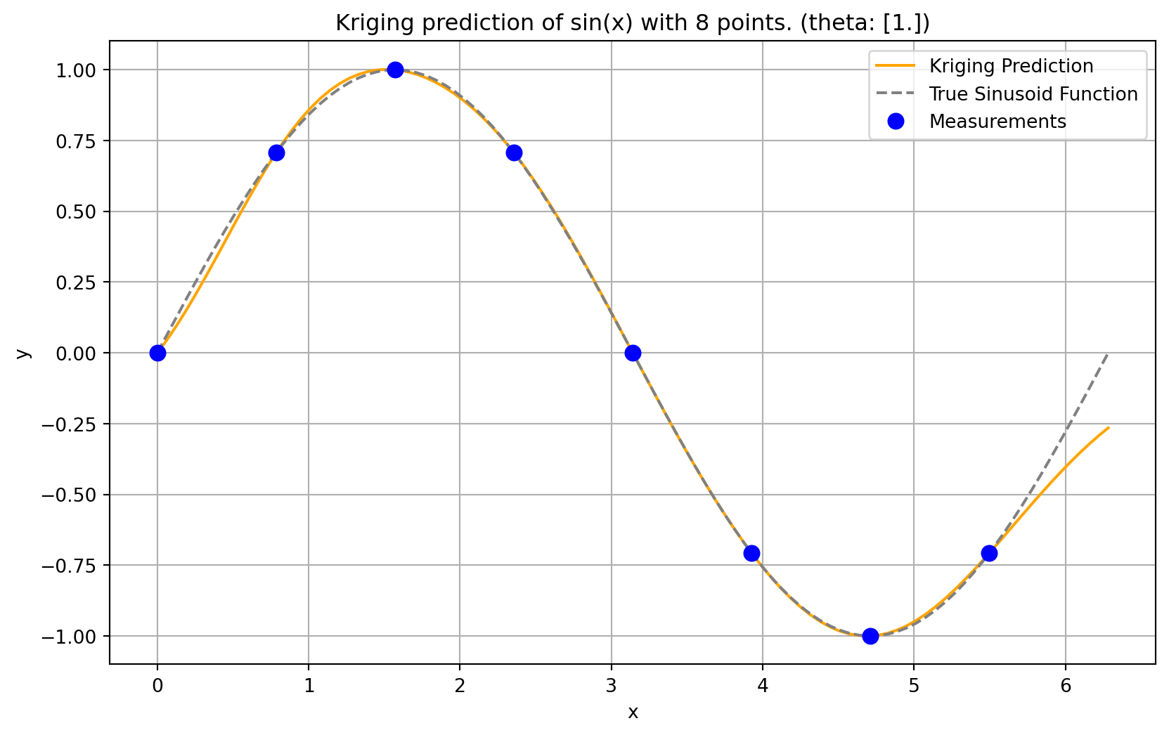 These enhancements make Kriging particularly well-suited for engineering problems where variables may operate at different scales or exhibit varying degrees of smoothness across dimensions. For now, we will only consider Kriging interpolation. We will cover Kriging regression later.