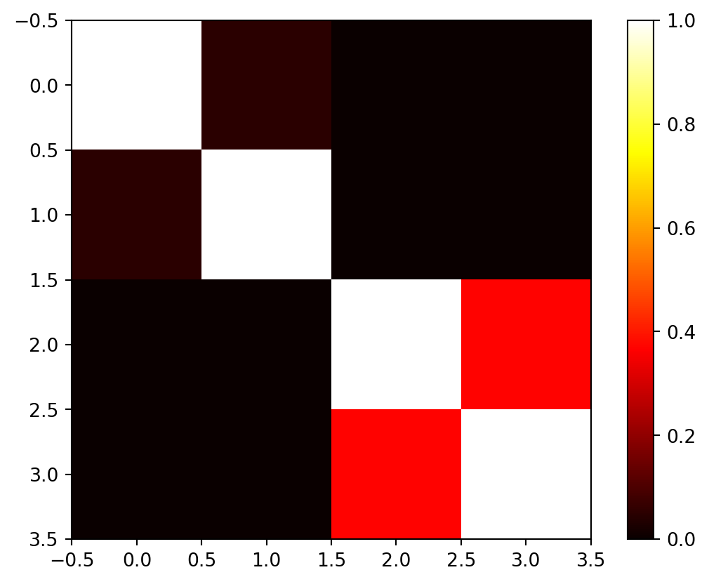 Example 32.4 (Example: The Correlation Matrix (Using Existing Functions)) The same result as computed in Example 32.3 can be obtained with existing python functions, e.g., from the package scipy.