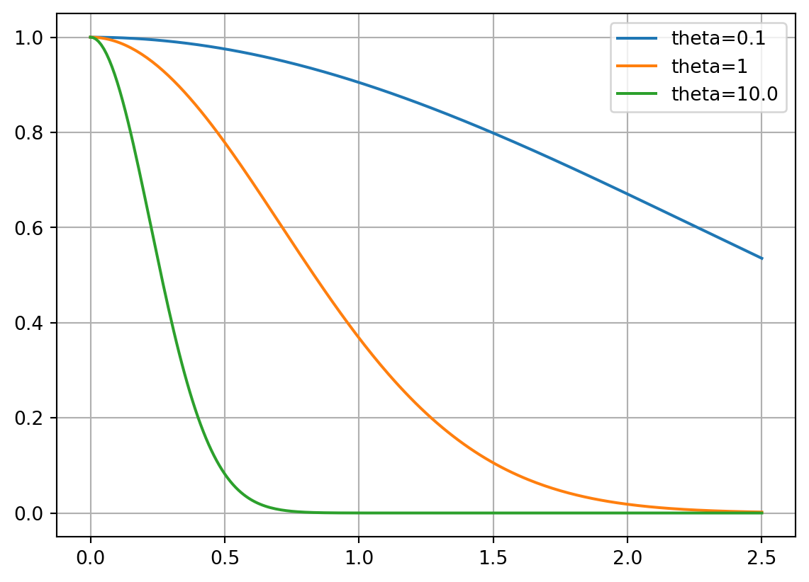 Example 32.2 (Correlations for different \(\theta\)) Figure 32.2 visualizes the correlation between two points \(Y(\vec{x}_j^{(i)})\) and \(Y(\vec{x}_j)\) for different values of \(\theta\). The parameter \(\theta\) can be seen as a width parameter: