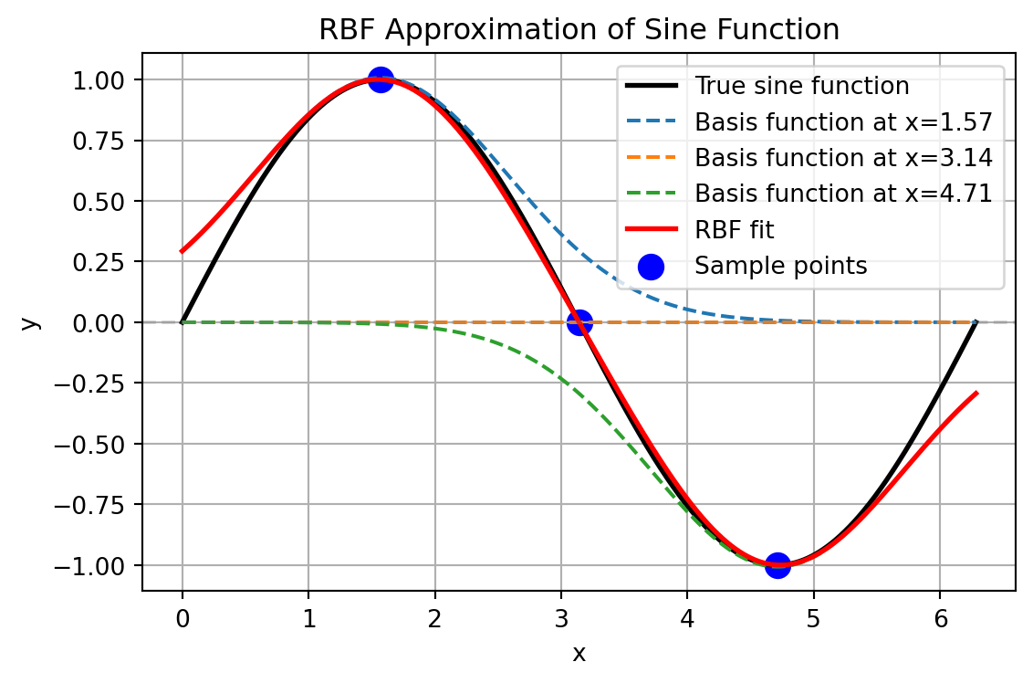 The RBF network approach, on the other hand, places basis functions at strategic points (e.g., 5 evenly spaced centers). Each neuron computes \(\psi(||x - c_i||)\) (e.g., using Gaussian RBF). The output layer combines these values with learned weights. If we place Gaussian RBFs with \(\sigma=0.15\) at \({0.1, 0.3, 0.5, 0.7, 0.9}\), each neuron responds strongly when the input is close to its center and weakly otherwise. The network can then learn weights that, when multiplied by these response patterns and summed, closely approximate the sine function.