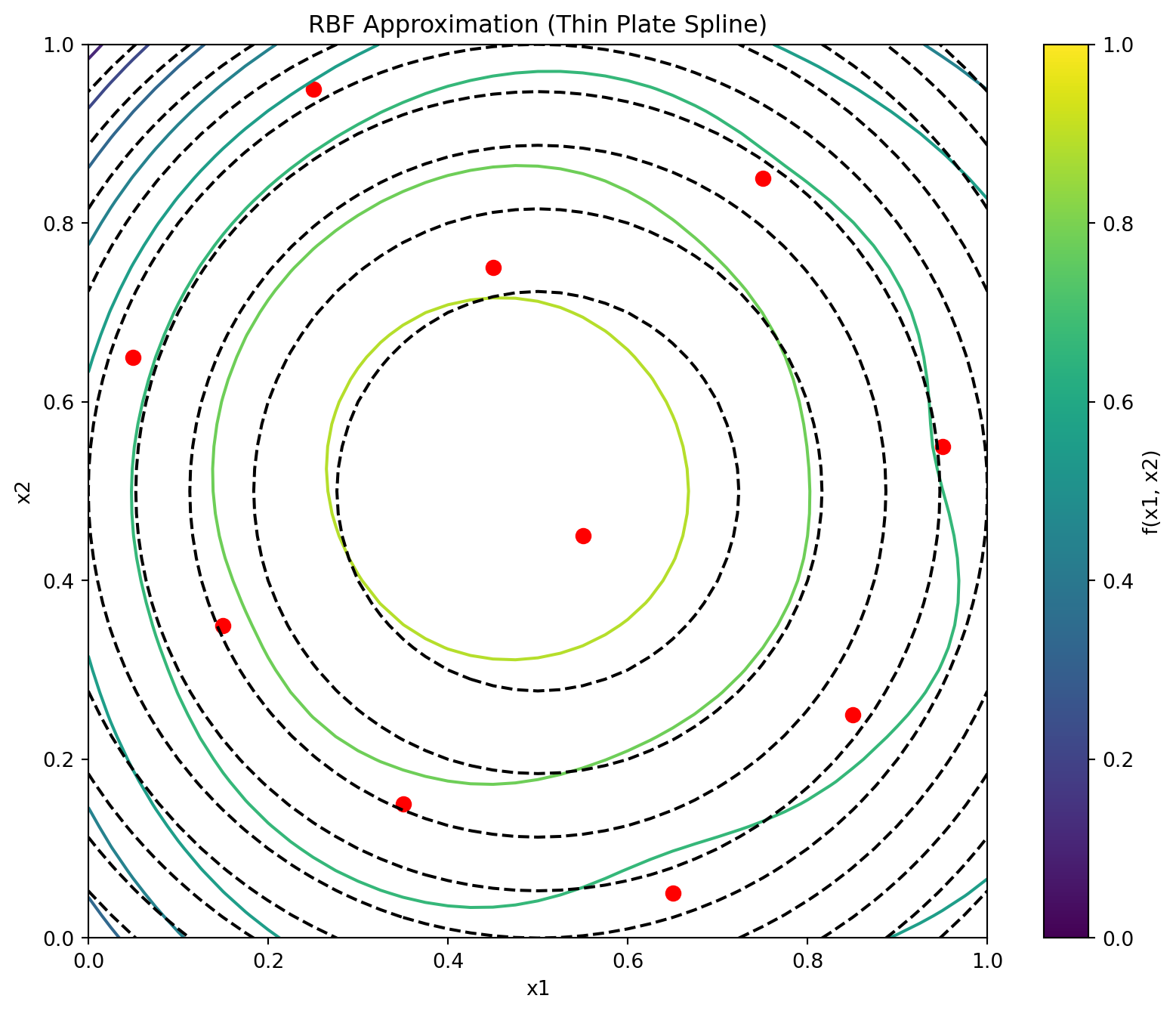 plt.show()Figure 31.3 shows the contour plots of the underlying function \(f(x_1, x_2) = 0.5[-(2x_1-1)^2-(2x_2-1)^2]\) and its thin plate spline radial basis function approximation, along with the 10 points of a Morris-Mitchell optimal Latin hypercube sampling plan (obtained via best_lh()).