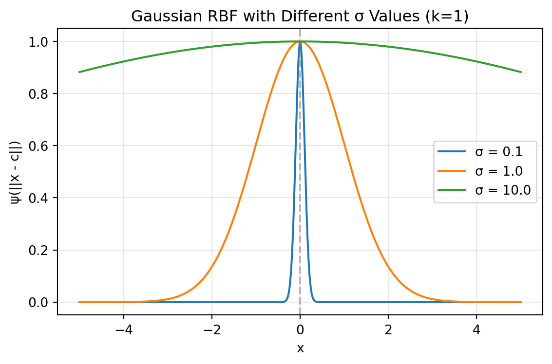 - Gaussian (\(\psi(r) = e^{-r^2/(2\sigma^2)}\)): Produces bell-shaped curves with \(\sigma\) controlling the width of influence