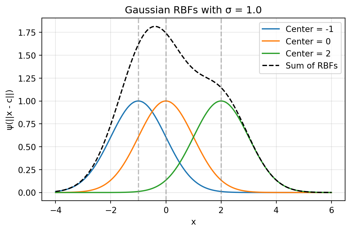 The sum of Gaussian RBFs can be visualized by summing the individual Gaussian RBFs centered at different points as shown in Figure 31.2. The following code snippet demonstrates how to create this plot showing the sum of three Gaussian RBFs with different centers and a common width parameter \(\sigma\).