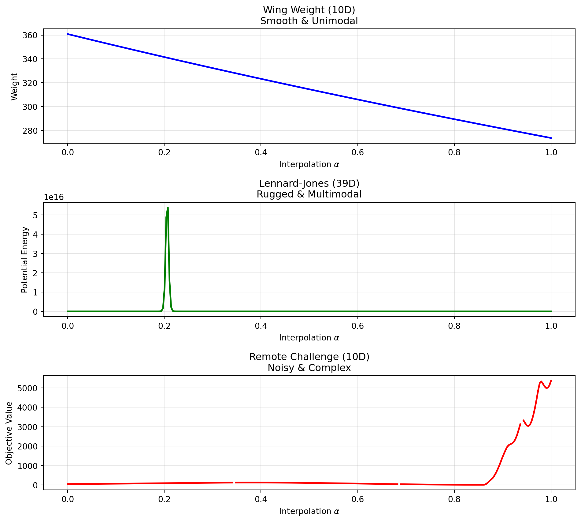- Well-Specified Problems: We employ the “Wing Weight” problem, hosted remotely, which represents a realistic, expensive black-box engineering problem. It is a 10-dimensional problem defined on the unit hypercube \([0, 1]^{10}\).