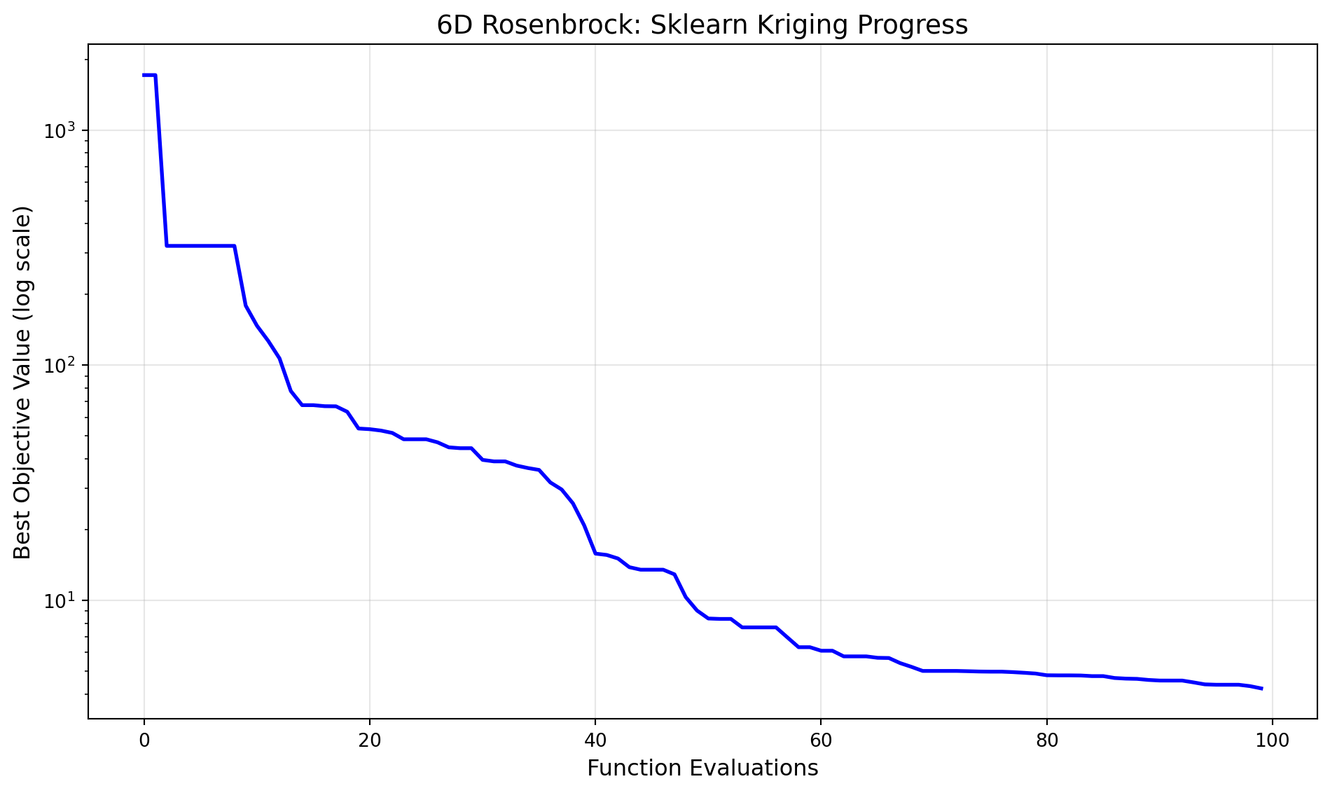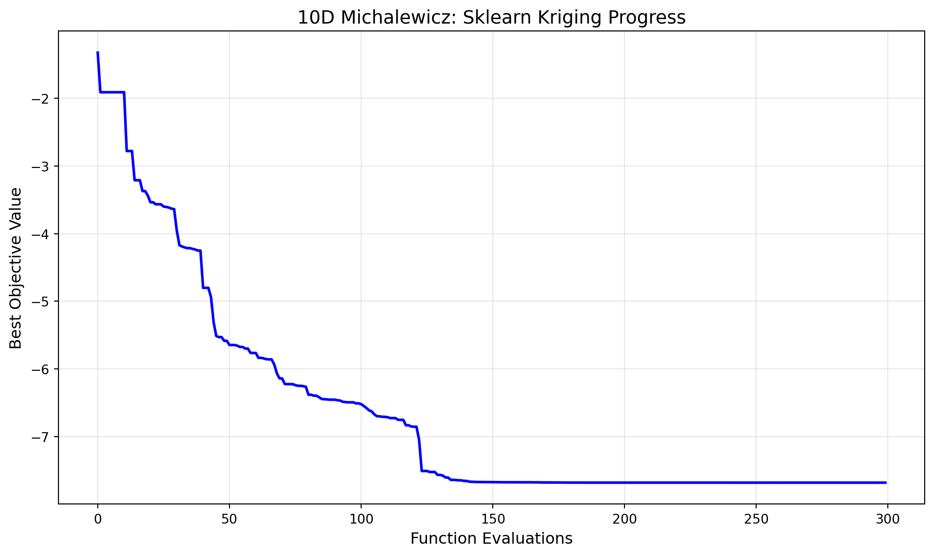 print(f"[10D] Sklearn Kriging: min y = {result_micha.fun:.4f} at x = {result_micha.x}")