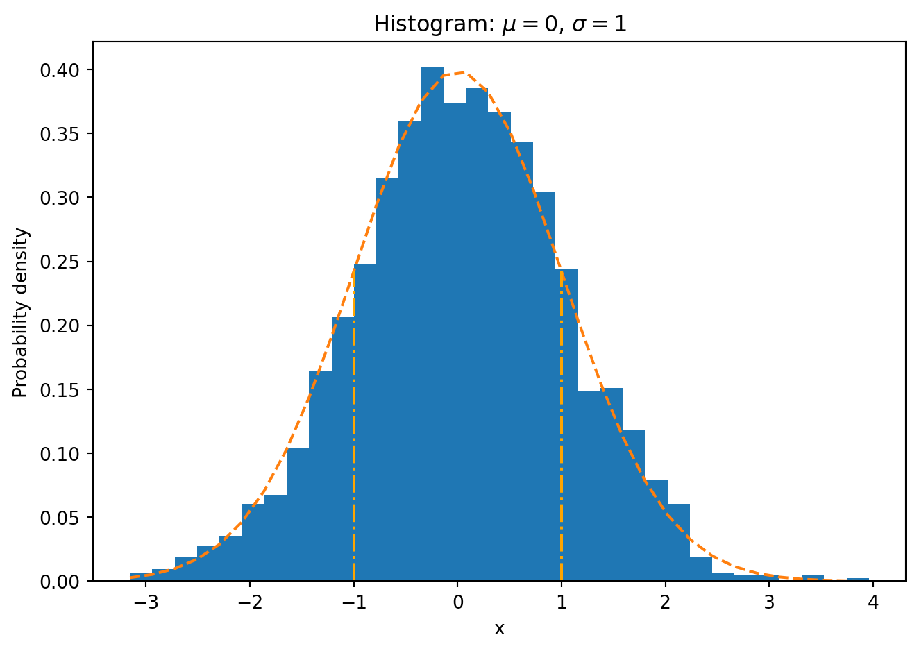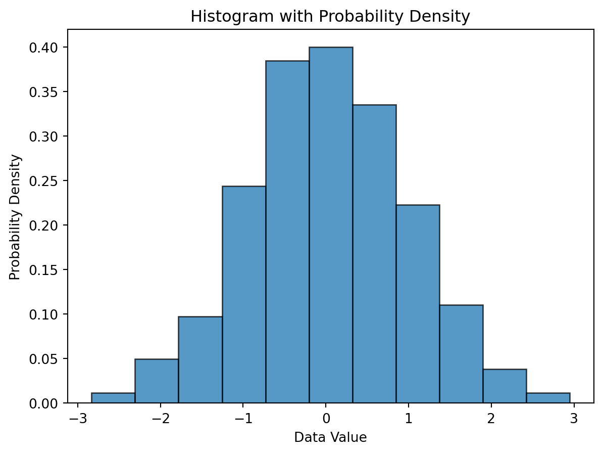 import numpy as npimport matplotlib.pyplot as plt# Sample data: Randomly generated for demonstrationdata = np.random.normal(0, 1, 1000) # 1000 data points with a normal distribution# Step 2: Decide on the number of binsnum_bins =int(np.ceil(1+3.322* np.log10(len(data)))) # Sturges' formula# Step 3: Determine range and bin width -- handled internally by matplotlib# Steps 4 & 5: Sort data into bins and draw the histogramfig, ax = plt.subplots()n, bins, patches = ax.hist(data, bins=num_bins, density=True, alpha=0.75, edgecolor='black')# Calculate probabilities (relative frequencies) manually, if neededbin_width = np.diff(bins) # np.diff finds the difference between adjacent bin boundariesprobabilities = n * bin_width # n is already normalized to form a probability density if `density=True`# Adding labels and title for clarityax.set_xlabel('Data Value')ax.set_ylabel('Probability Density')ax.set_title('Histogram with Probability Density')