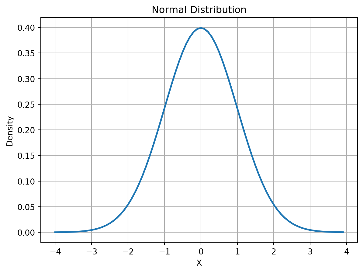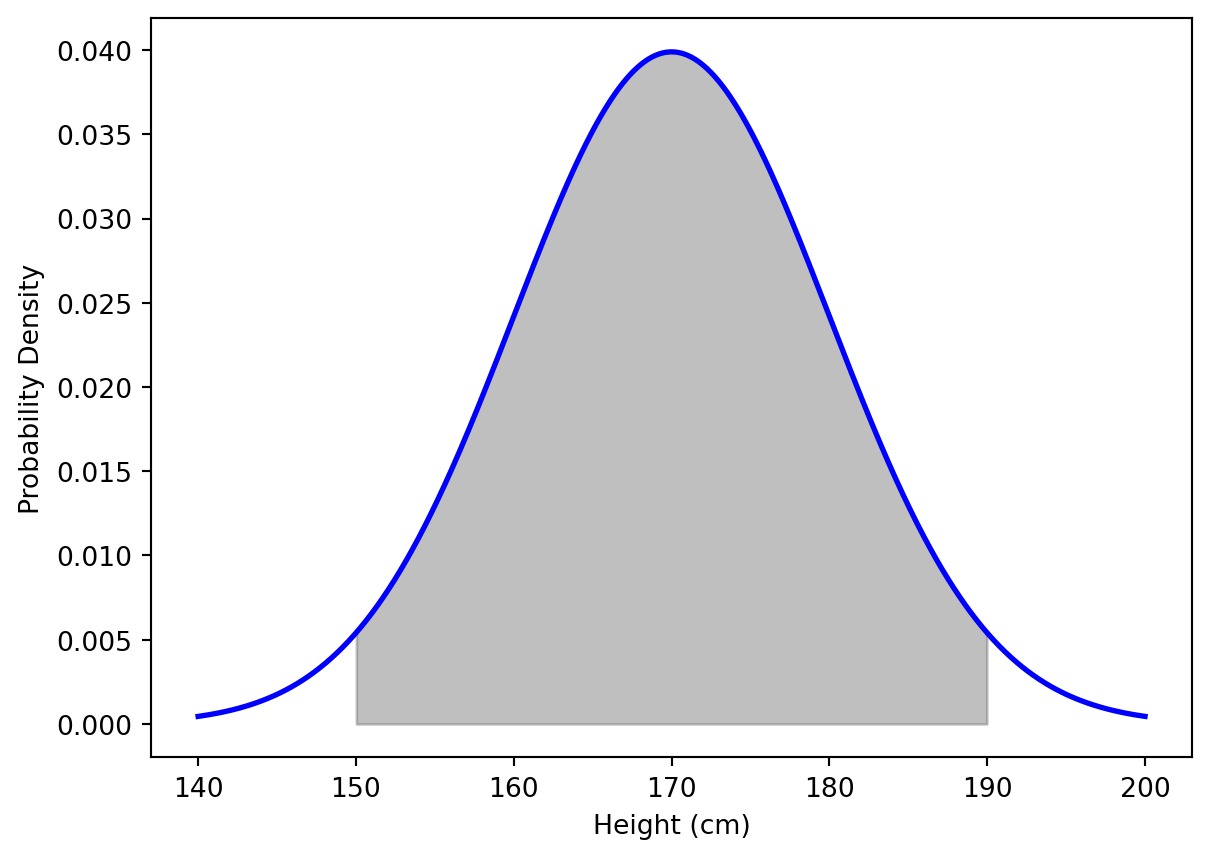 Definition 42.5 (Probability Density Function (PDF):)\(f_X(x)\) is a function such that for any interval \([a, b]\), the probability that \(X\) falls within this interval is given by the integral \(\int_a^b f_X(x) \mathrm{d}x\).
