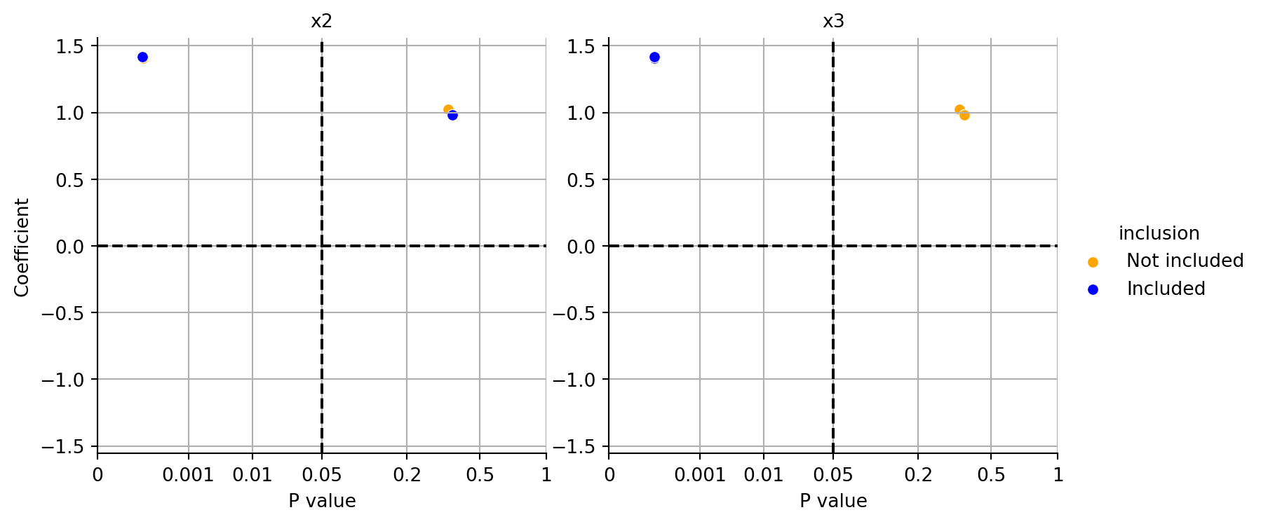 In addition to the textural output, the function plot_coeff_vs_pvals_by_included() can be used to visualize the coefficients and p-values of the fitted models.