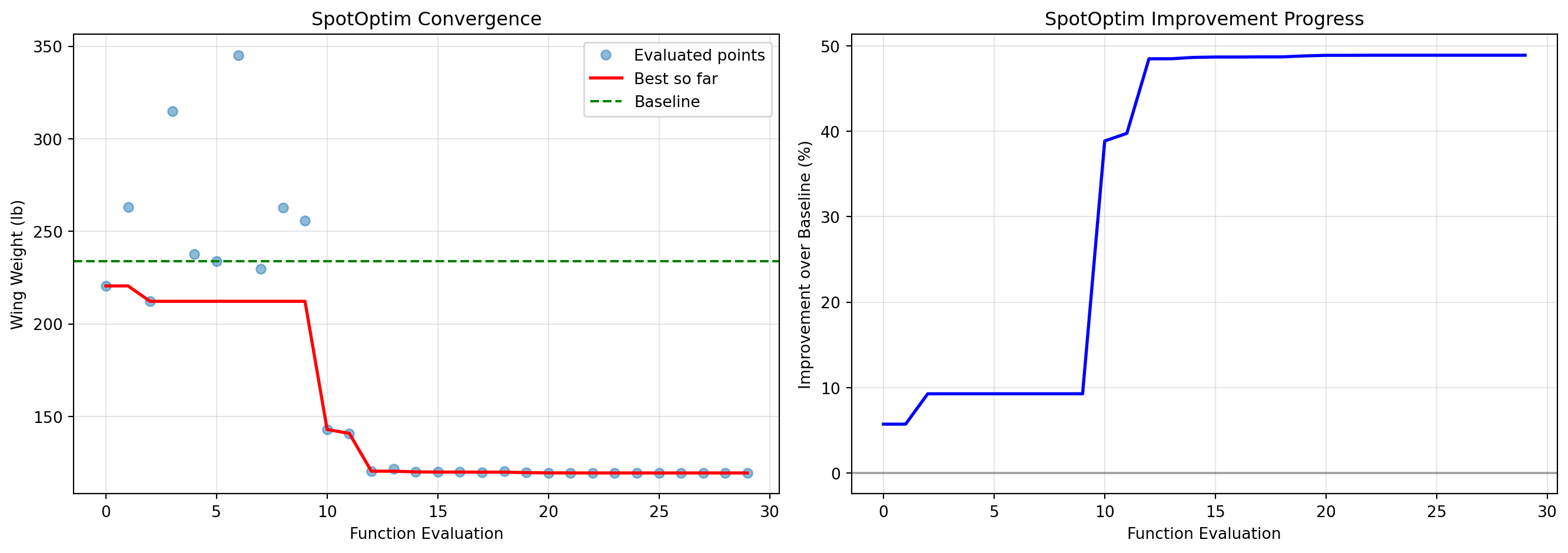 For aircraft design problems with expensive simulations, Bayesian optimization (SpotOptim) offers the best balance of efficiency and solution quality, making it particularly suitable for real-world engineering applications.