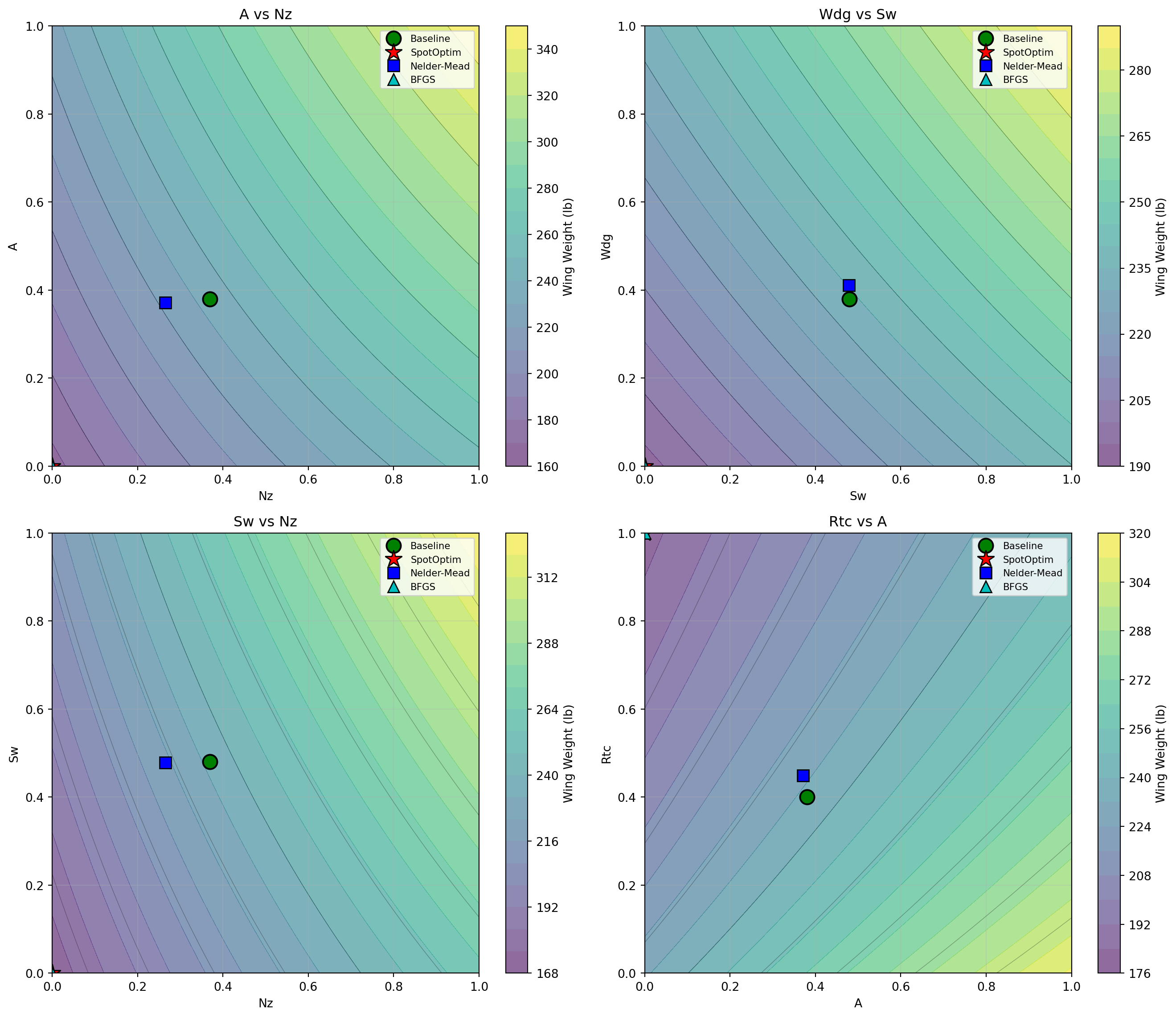 This analysis demonstrates the application of different optimization methods to the Aircraft Wing Weight Example. Key takeaways: