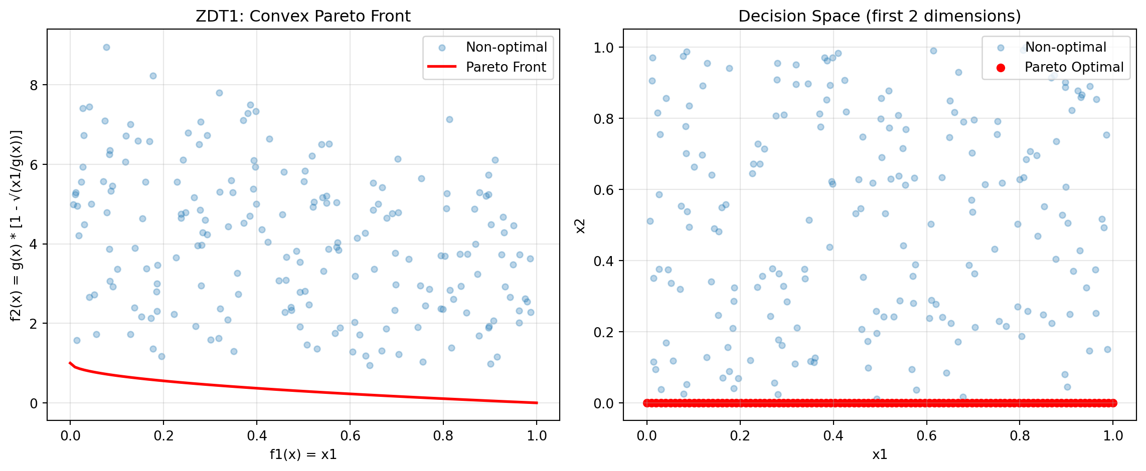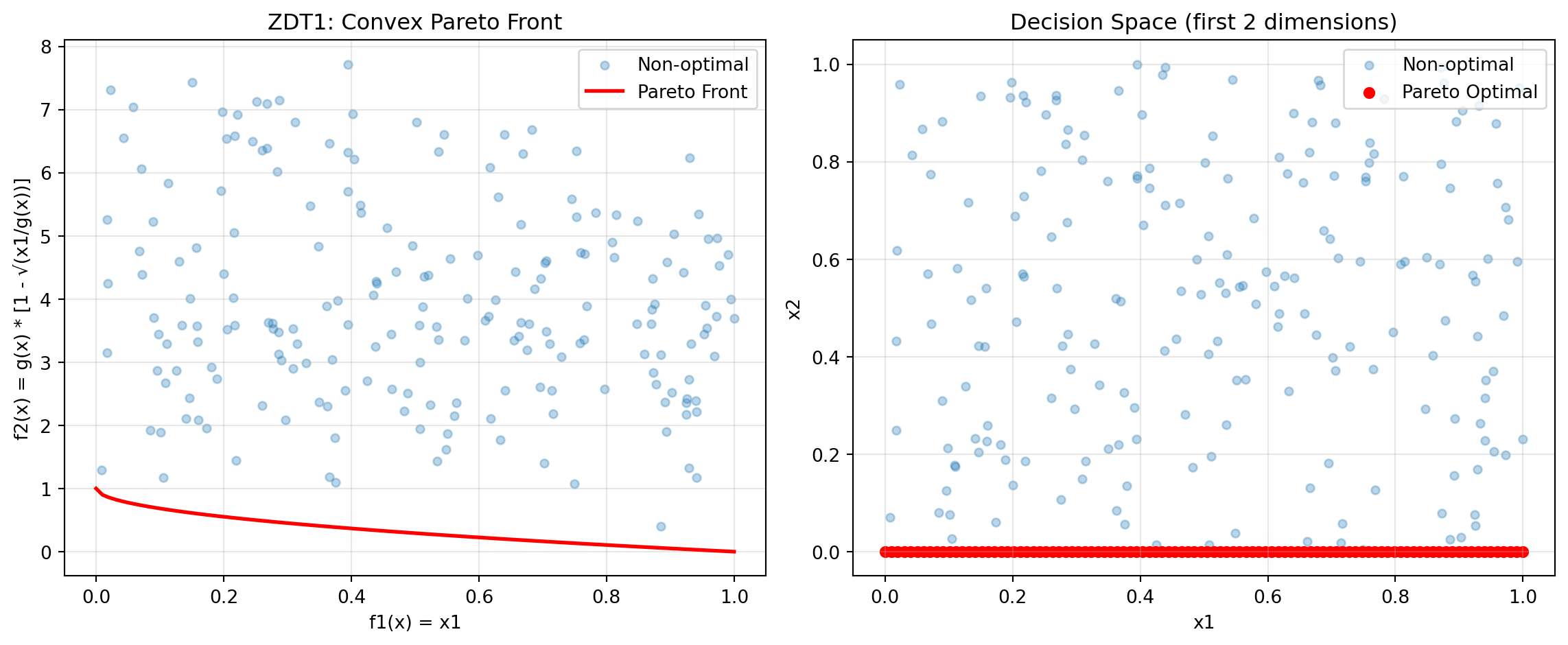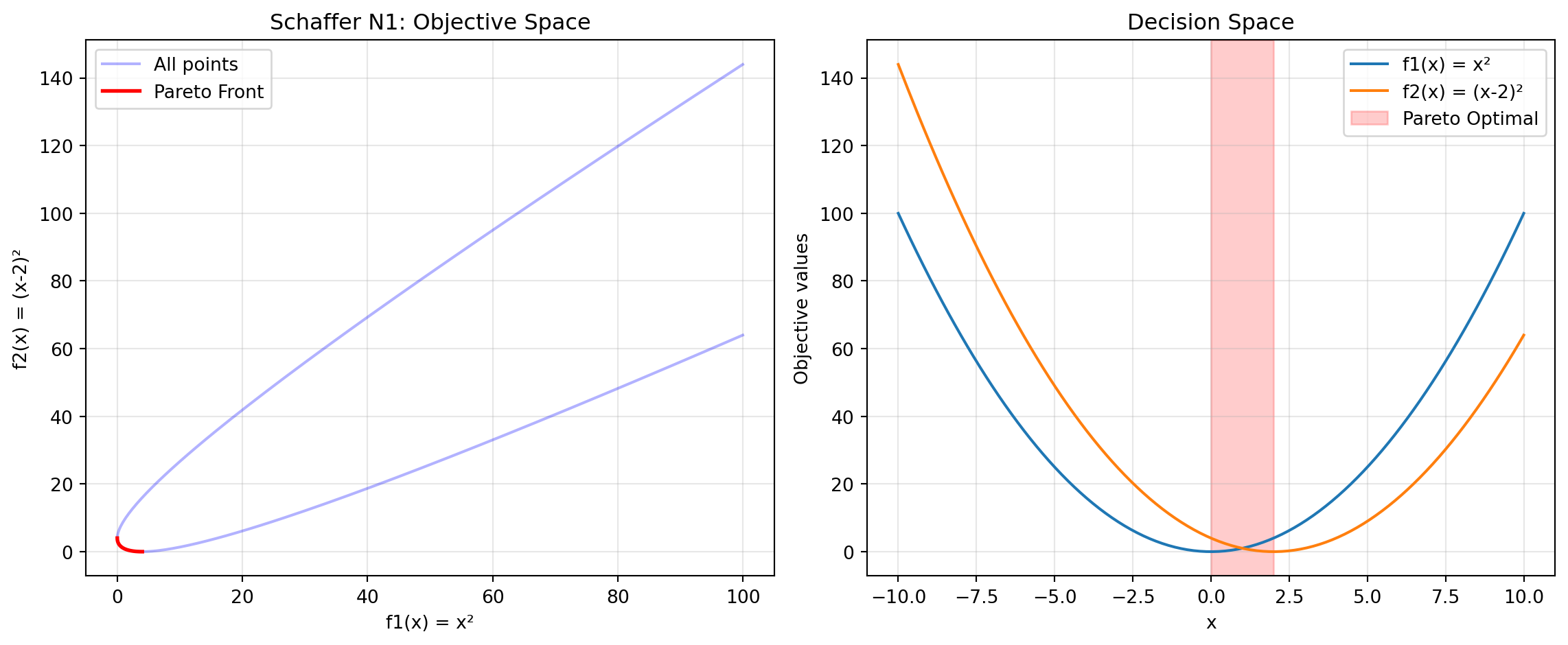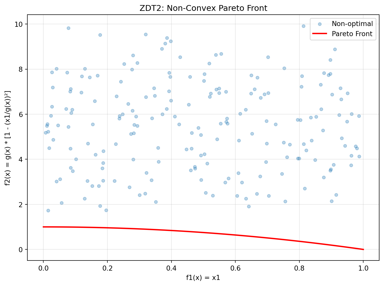 - Pareto front: convex quadratic trade-off \(f1 = 2 - 2t^2\), \(f2 = 2 - 2(1 - t)^2\), \(t \in [0, 1]\)
