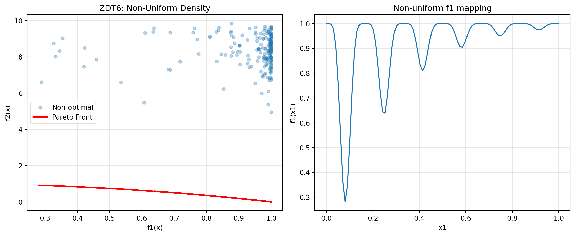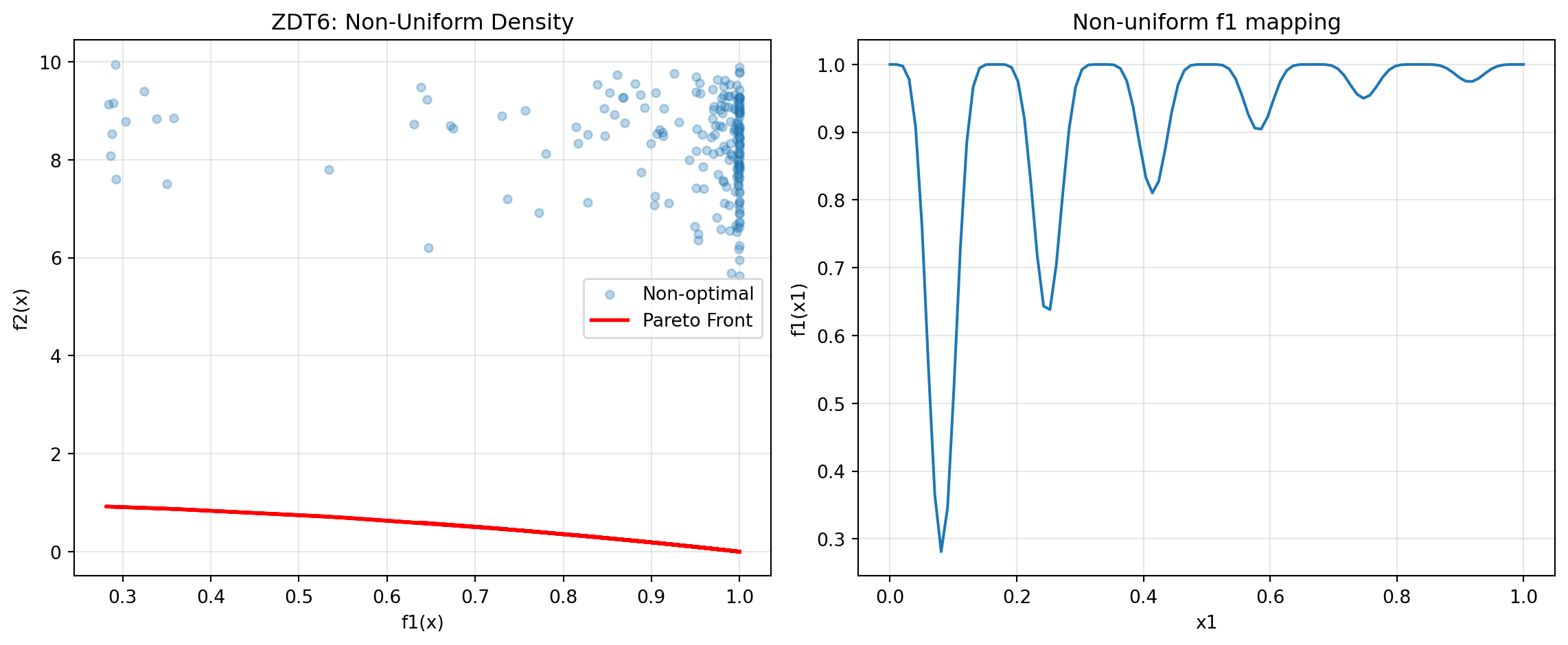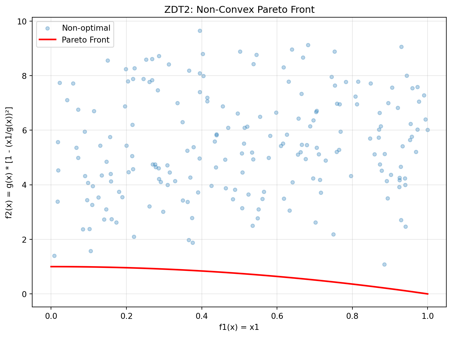 - Pareto front: convex quadratic trade-off \(f1 = 2 - 2t^2\), \(f2 = 2 - 2(1 - t)^2\), \(t \in [0, 1]\)