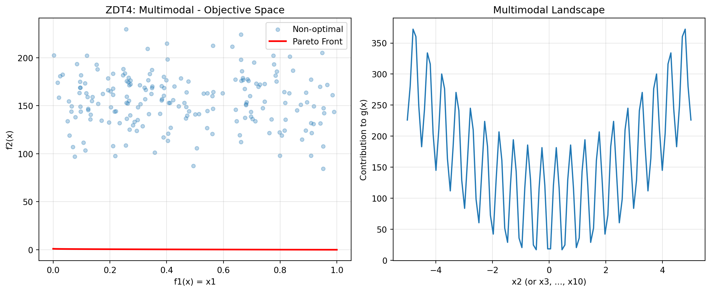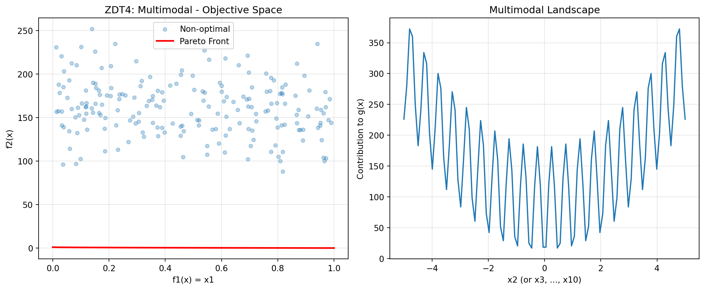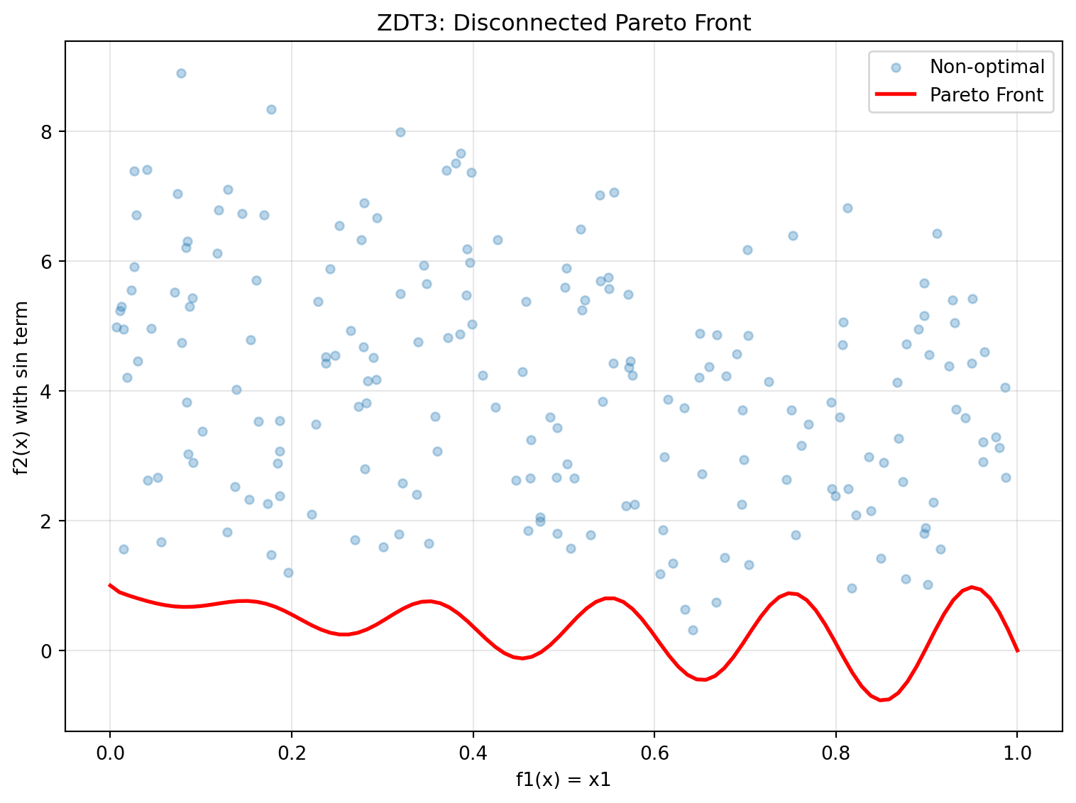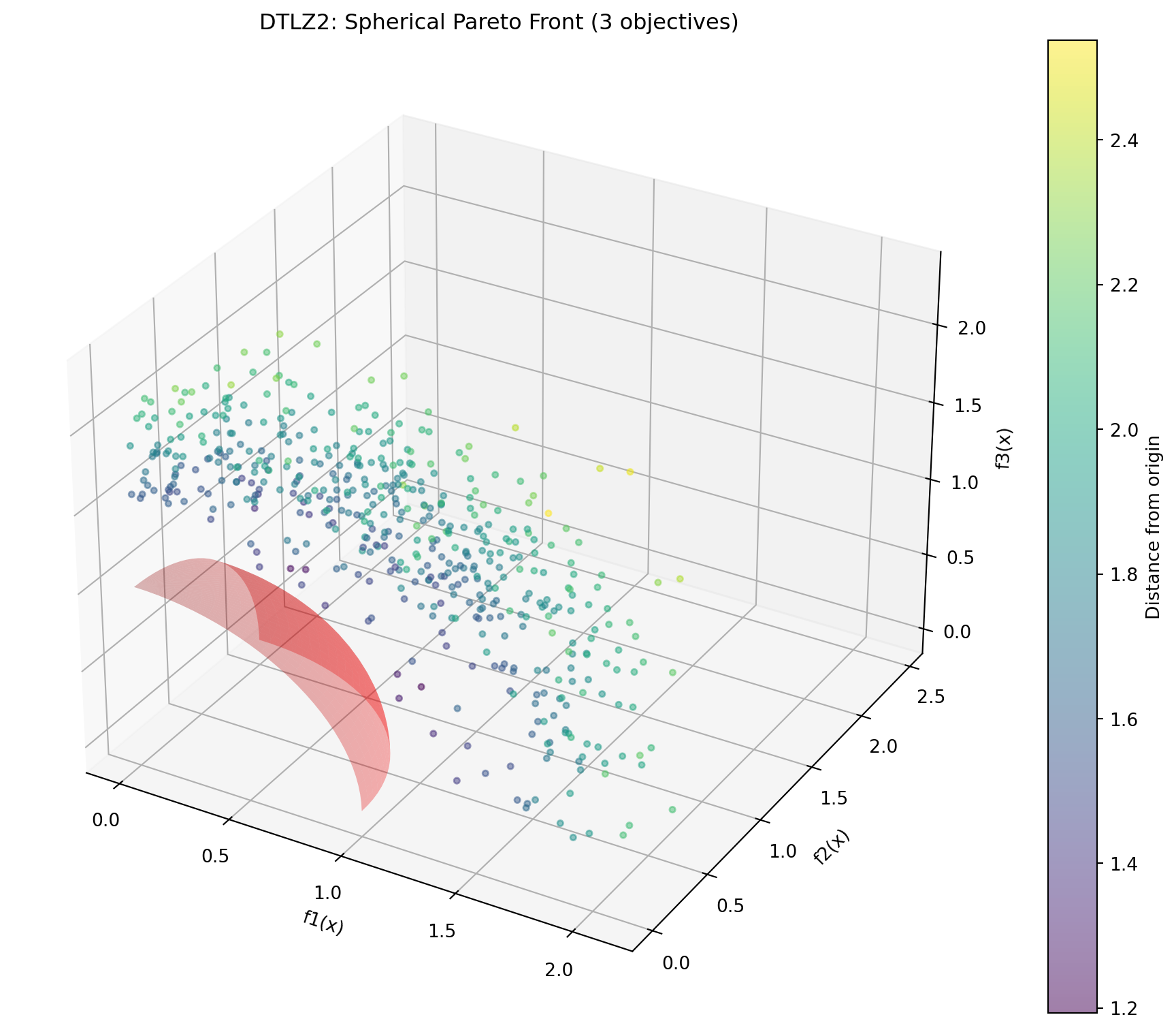 - Pareto front: convex quadratic trade-off \(f1 = 2 - 2t^2\), \(f2 = 2 - 2(1 - t)^2\), \(t \in [0, 1]\)