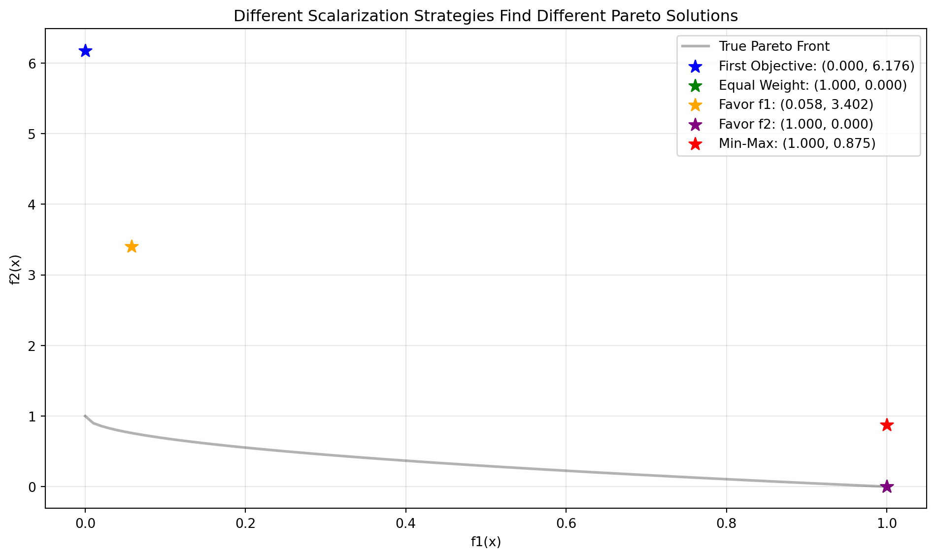 Let’s compare how different scalarization strategies find different Pareto solutions: