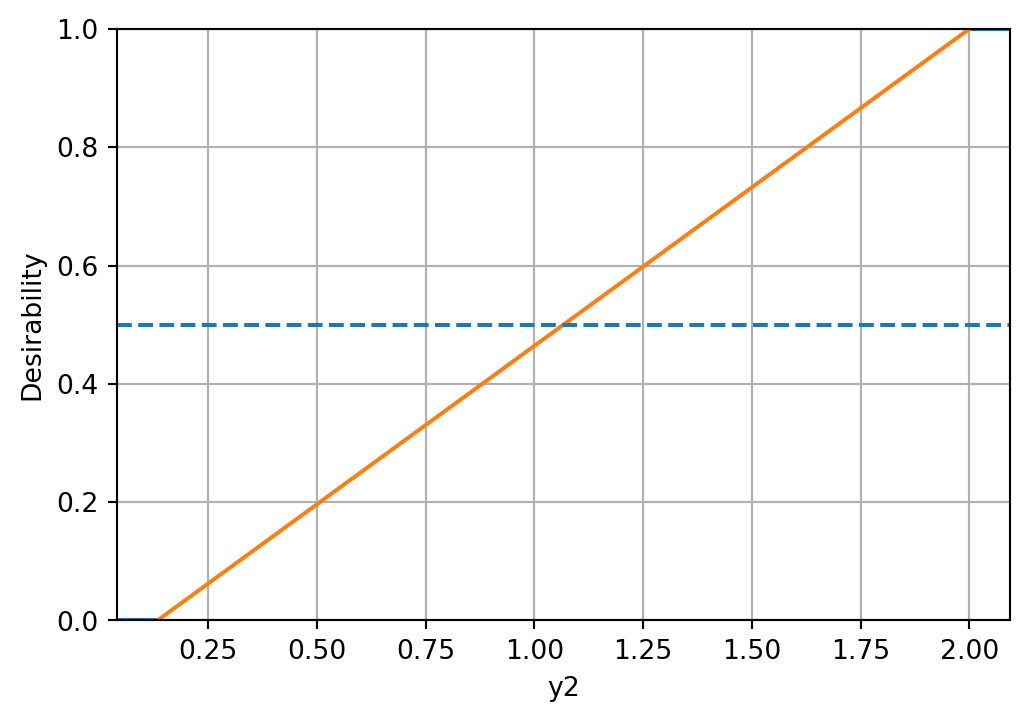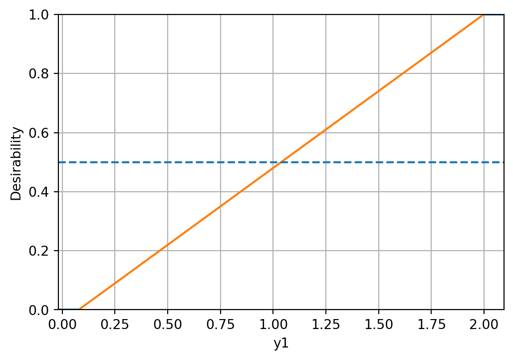 d_funcs.append(d_func)The desirability functions can be visualized as follows: