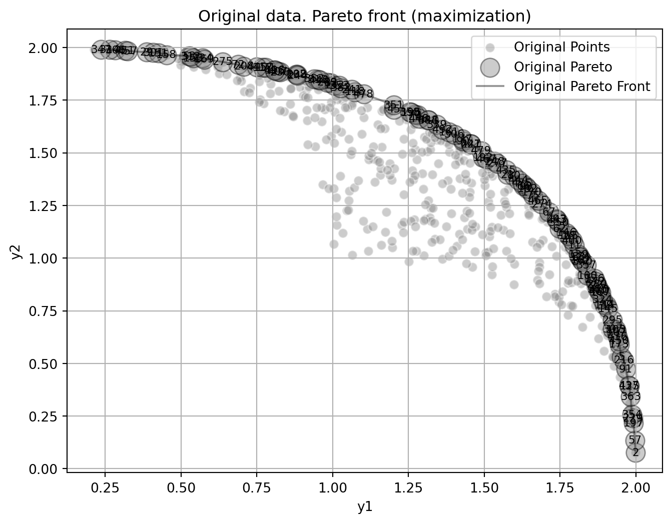mo_pareto_optx_plot(X=X_base, Y=y, minimize=False)