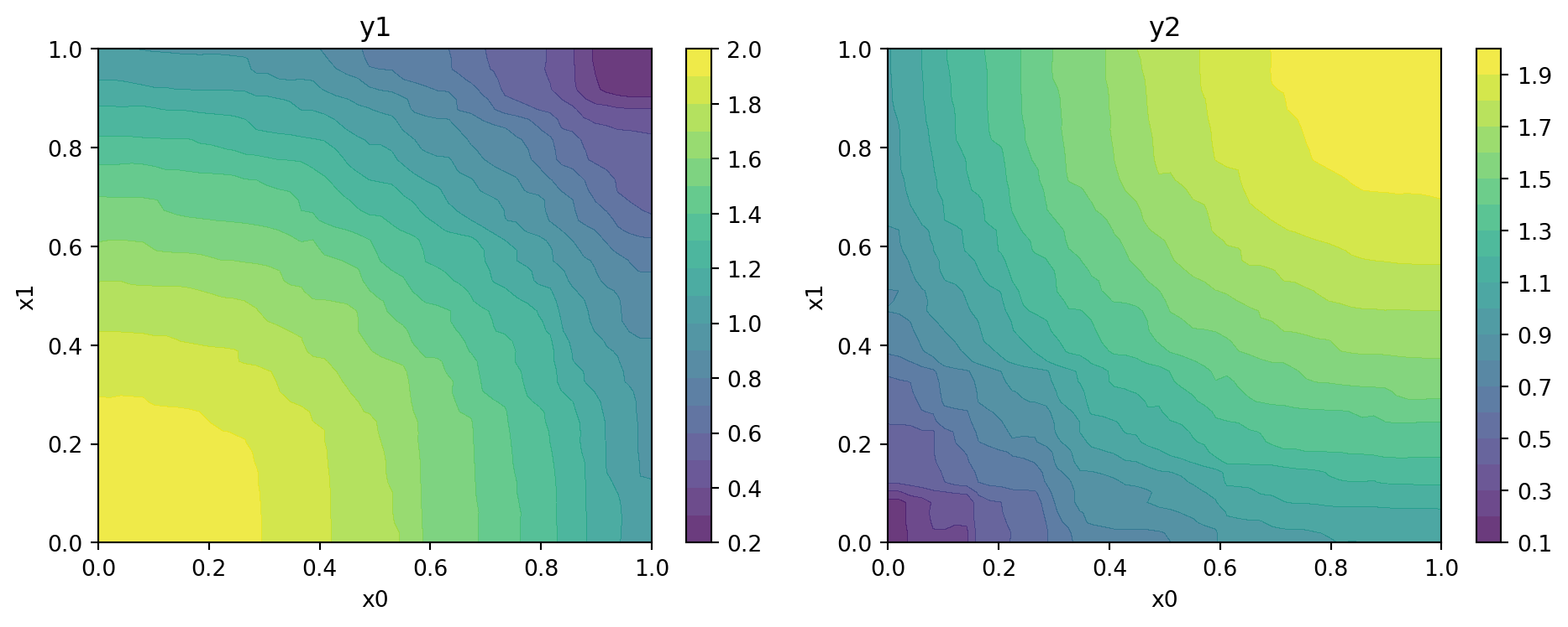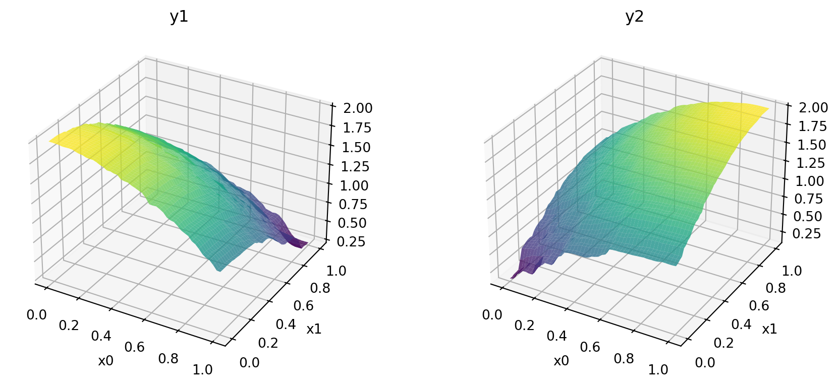 \[\begin{align} f1(x, y) = 2 - (x^2 + y^2)\\ f2(x, y) = 2 - ((1 - x)^2 + (1 - y)^2) \end{align}\]