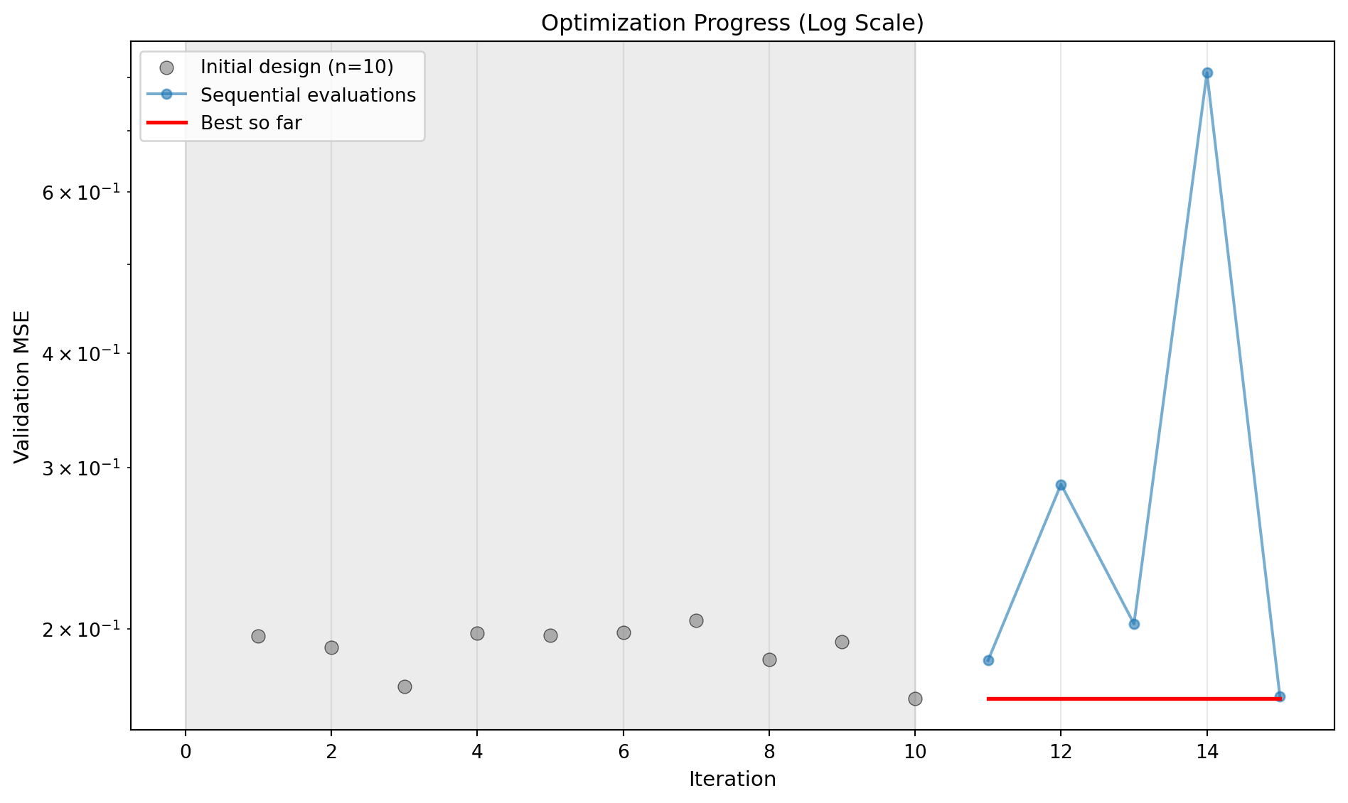 This tutorial also showcases SpotOptim’s var_trans feature for automatic variable transformations. Learning rates and regularization parameters are often best explored on a log scale, but manually transforming values is tedious and error-prone. With var_trans, you simply specify: