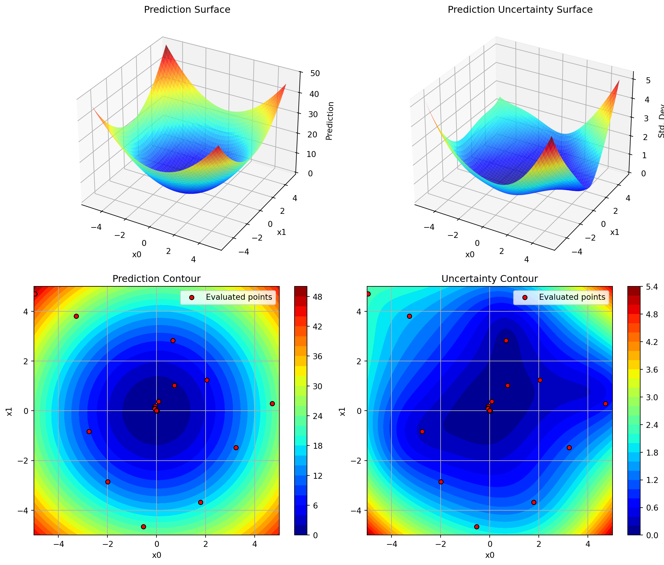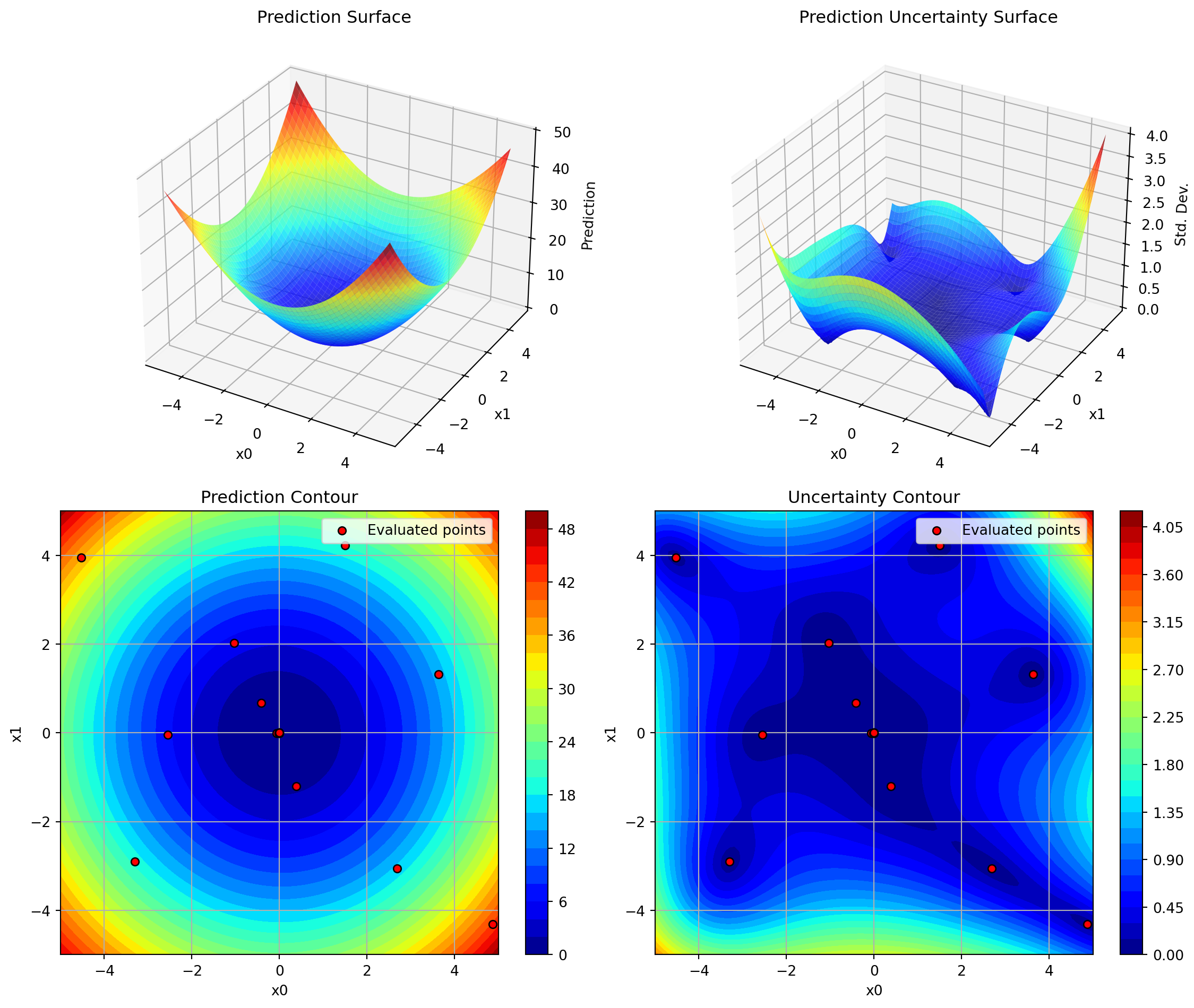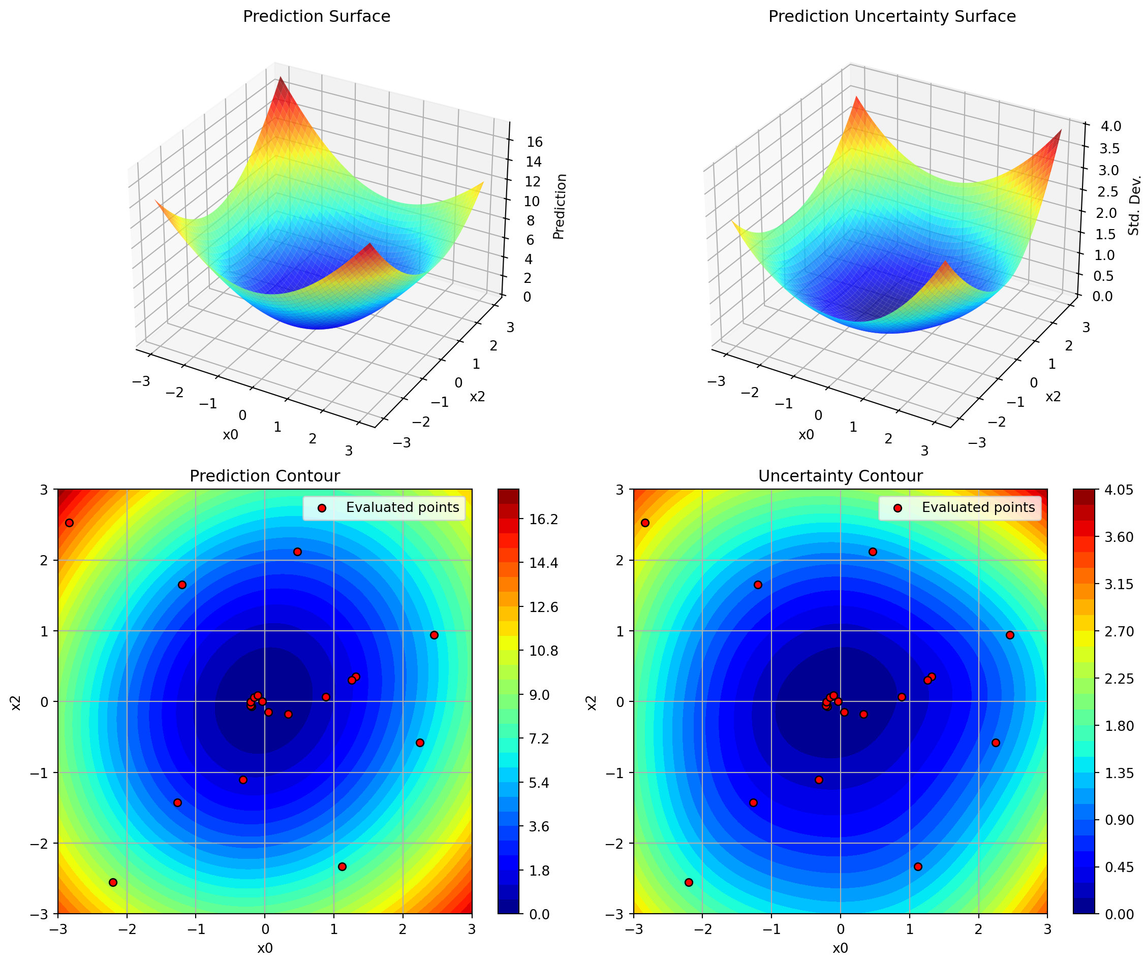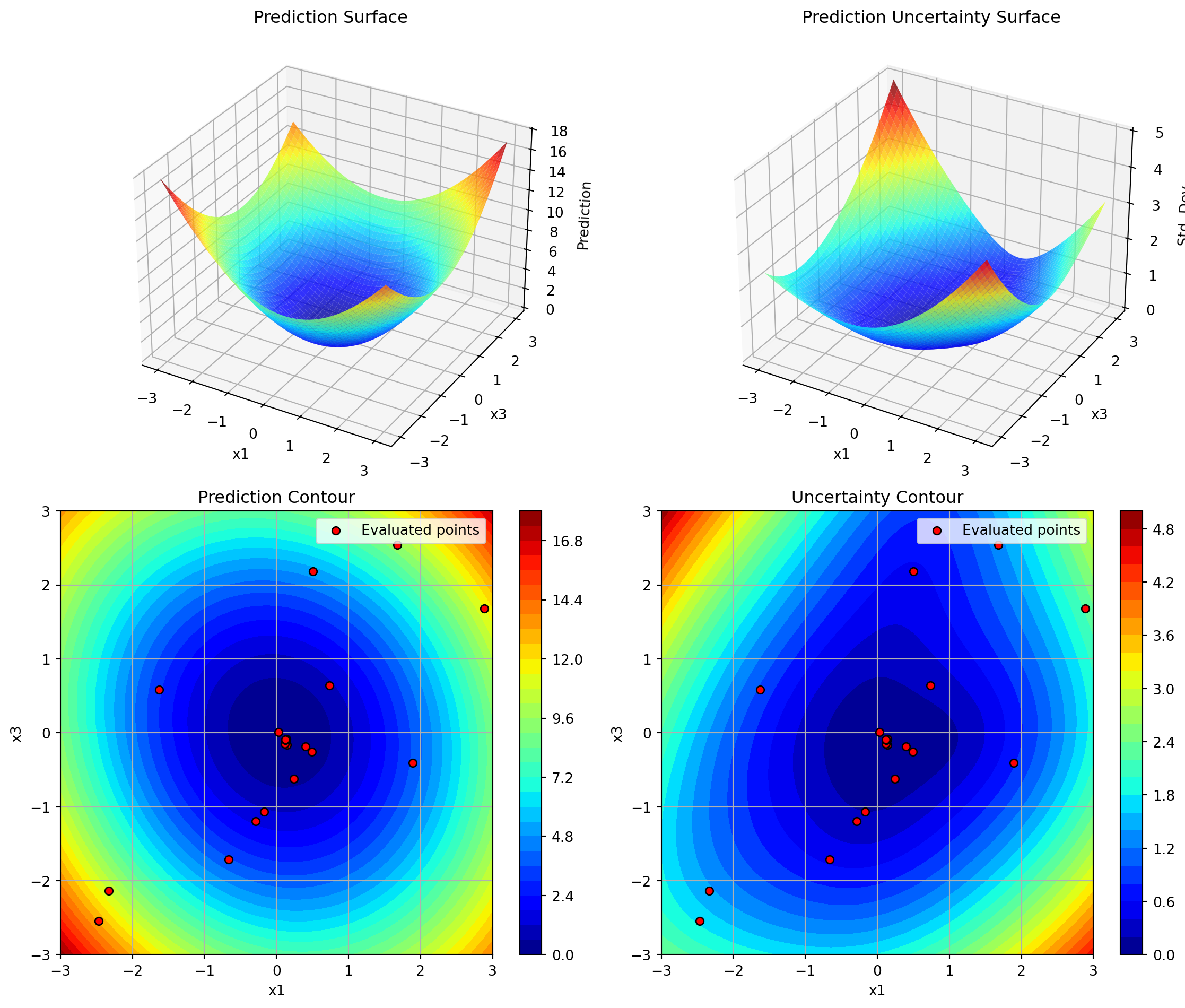 3D Surface Plots: Visualize the surrogate’s predictions and uncertainty as 3D surfaces
