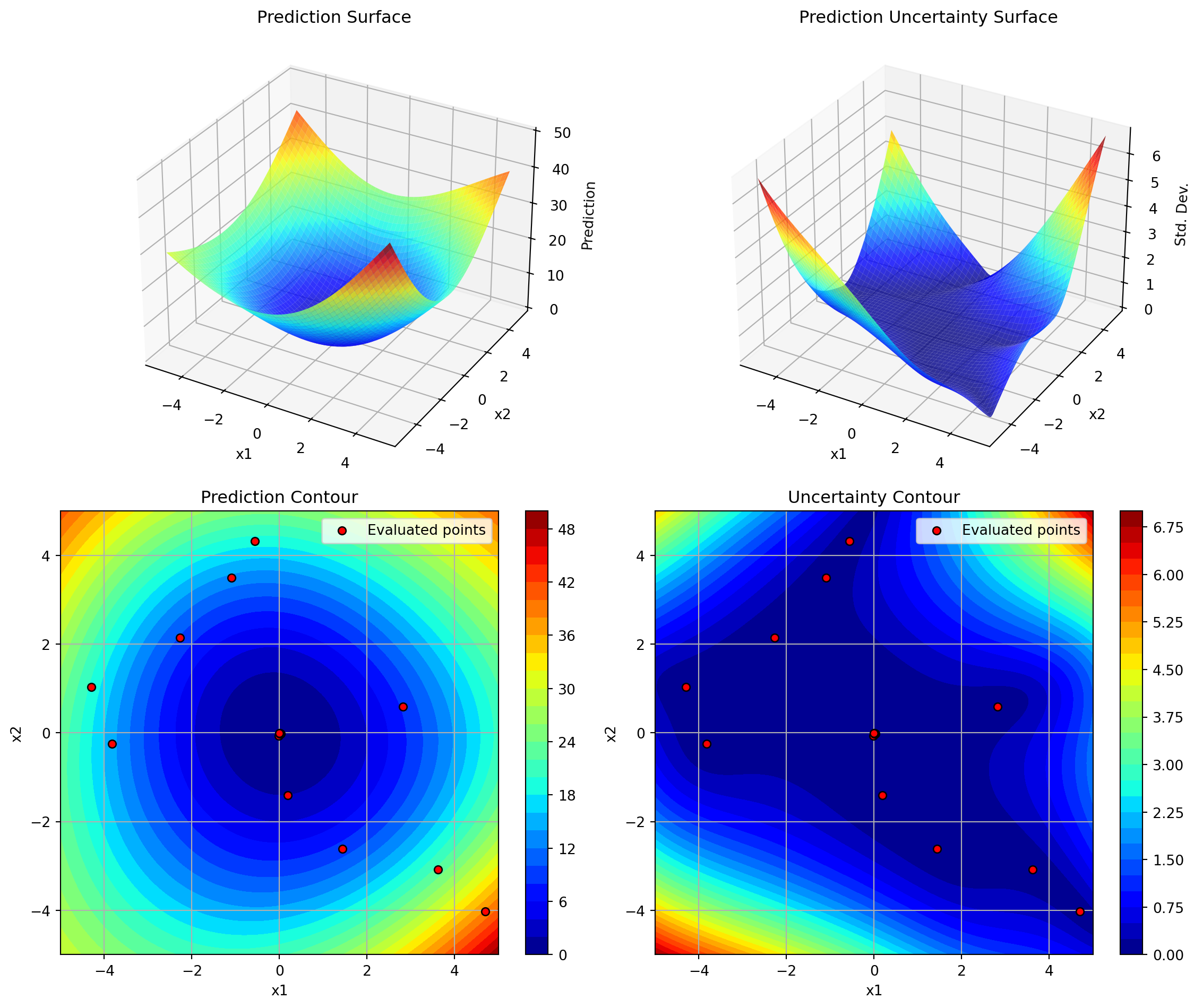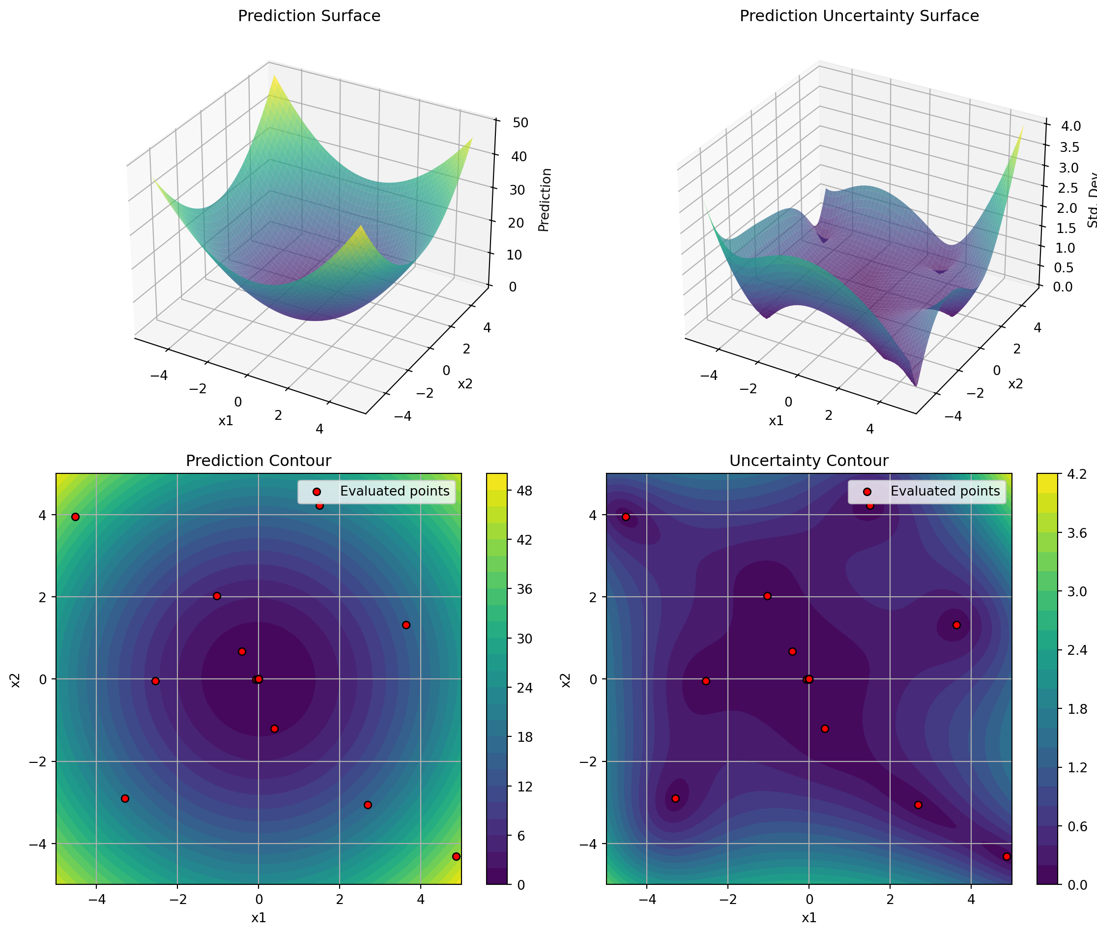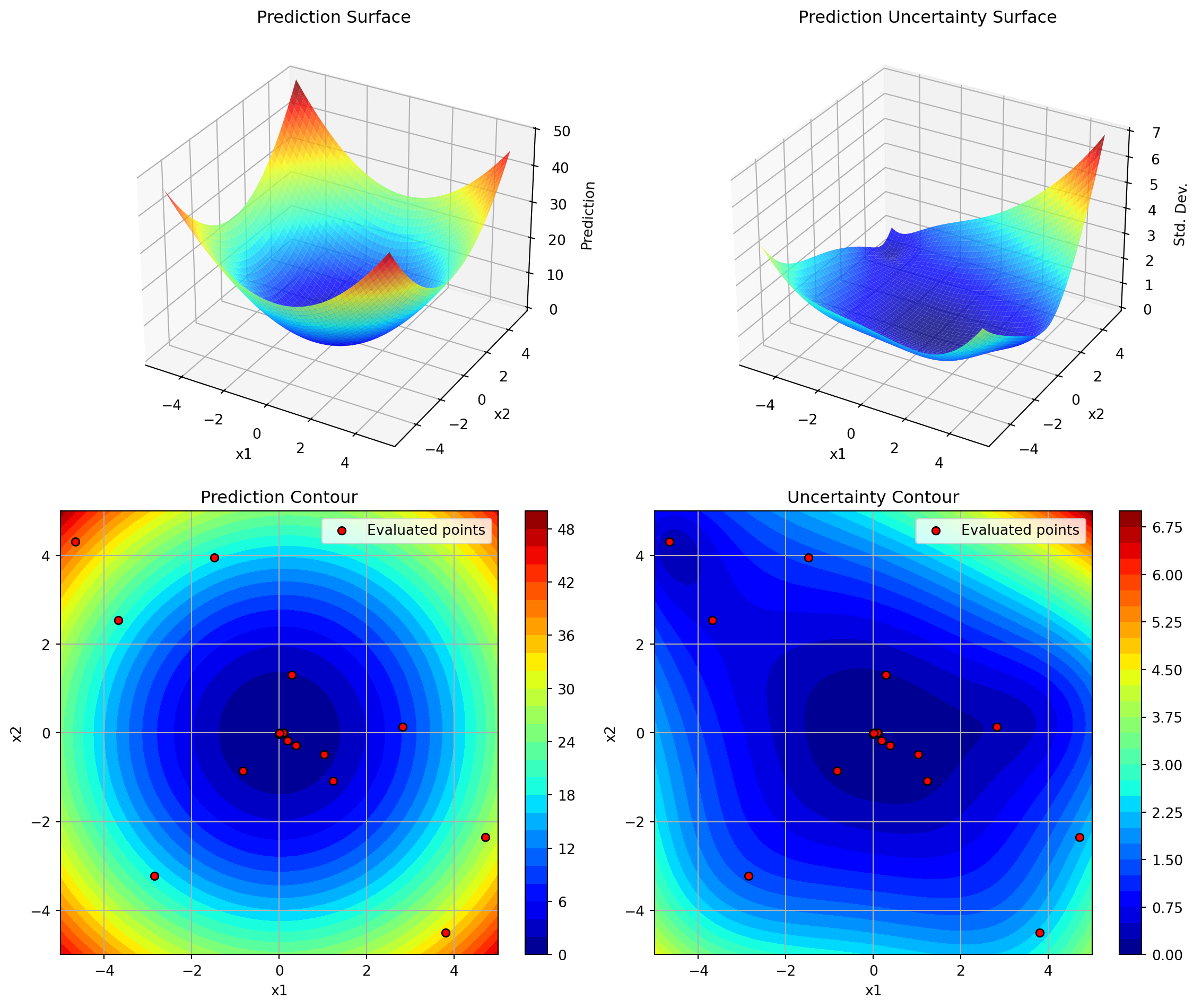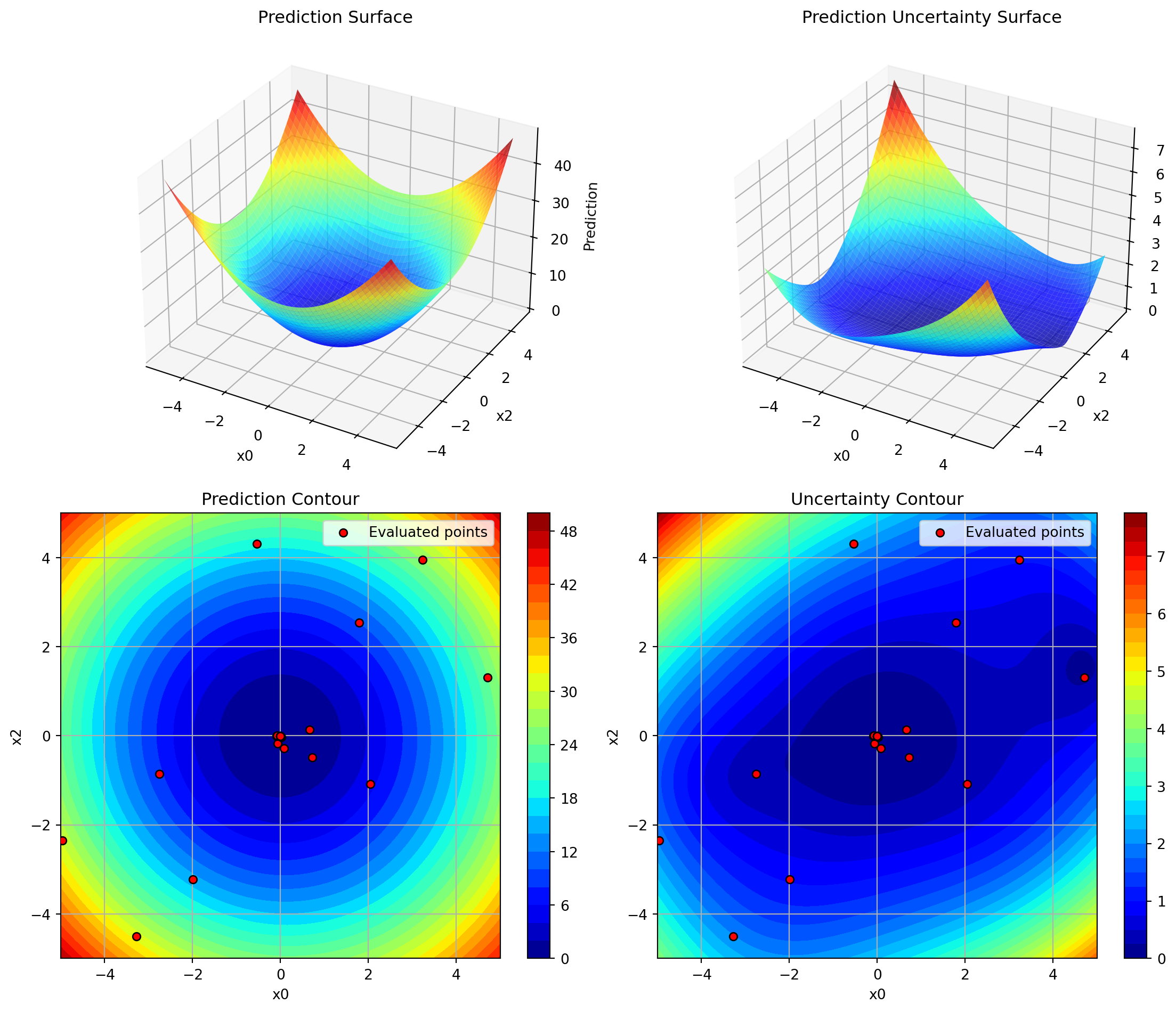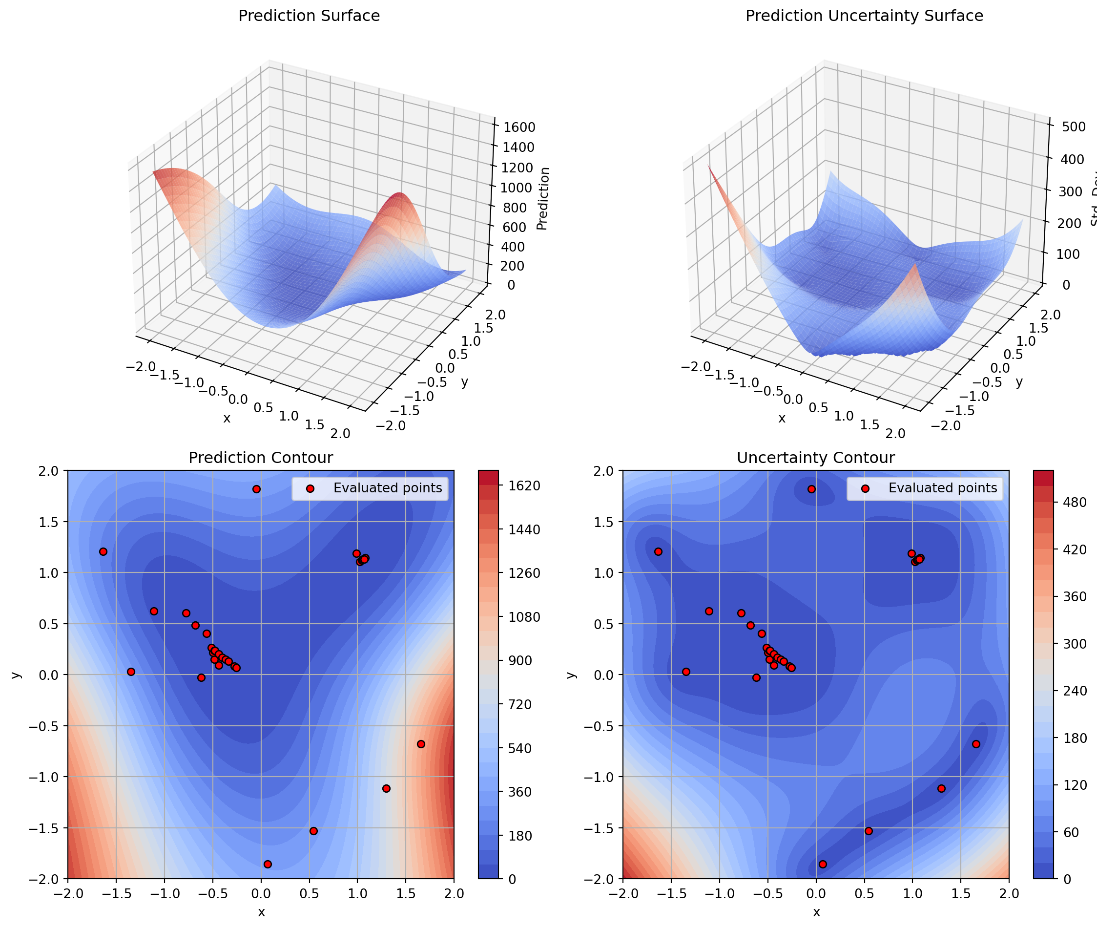 3D Surface Plots: Visualize the surrogate’s predictions and uncertainty as 3D surfaces