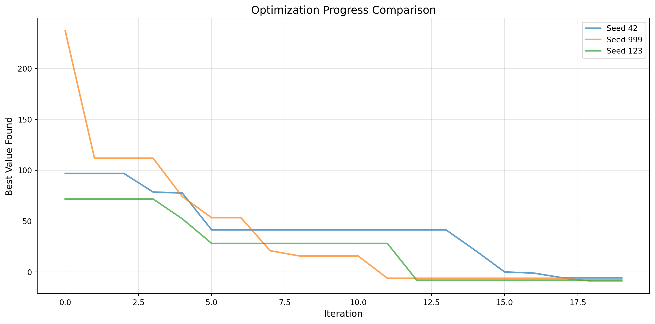 # analyze_results.pyimport numpy as npfrom spotoptim import SpotOptimimport globimport matplotlib.pyplot as plt# Find all result filesresult_files = glob.glob("experiments/*_res.pkl")print(f"Found {len(result_files)} results to analyze")# Load and compare resultsresults = []for res_file in result_files: opt = SpotOptim.load_result(res_file) results.append({"file": res_file,"best_value": opt.best_y_,"best_point": opt.best_x_,"n_evals": opt.counter,"seed": opt.seed })print(f"{res_file}: best={opt.best_y_:.6f}, evals={opt.counter}")# Find best overall resultbest =min(results, key=lambda x: x["best_value"])print(f"\nBest result:")print(f" File: {best['file']}")print(f" Value: {best['best_value']:.6f}")print(f" Point: {best['best_point']}")print(f" Seed: {best['seed']}")# Plot convergence comparisonplt.figure(figsize=(12, 6))for res_file in result_files: opt = SpotOptim.load_result(res_file) seed = opt.seed cummin = [opt.y_[:i+1].min() for i inrange(len(opt.y_))] plt.plot(cummin, label=f"Seed {seed}", linewidth=2, alpha=0.7)plt.xlabel("Iteration", fontsize=12)plt.ylabel("Best Value Found", fontsize=12)plt.title("Optimization Progress Comparison", fontsize=14)plt.legend()plt.grid(True, alpha=0.3)plt.tight_layout()plt.savefig("experiments/convergence_comparison.png", dpi=150)print("\nConvergence plot saved to: experiments/convergence_comparison.png")