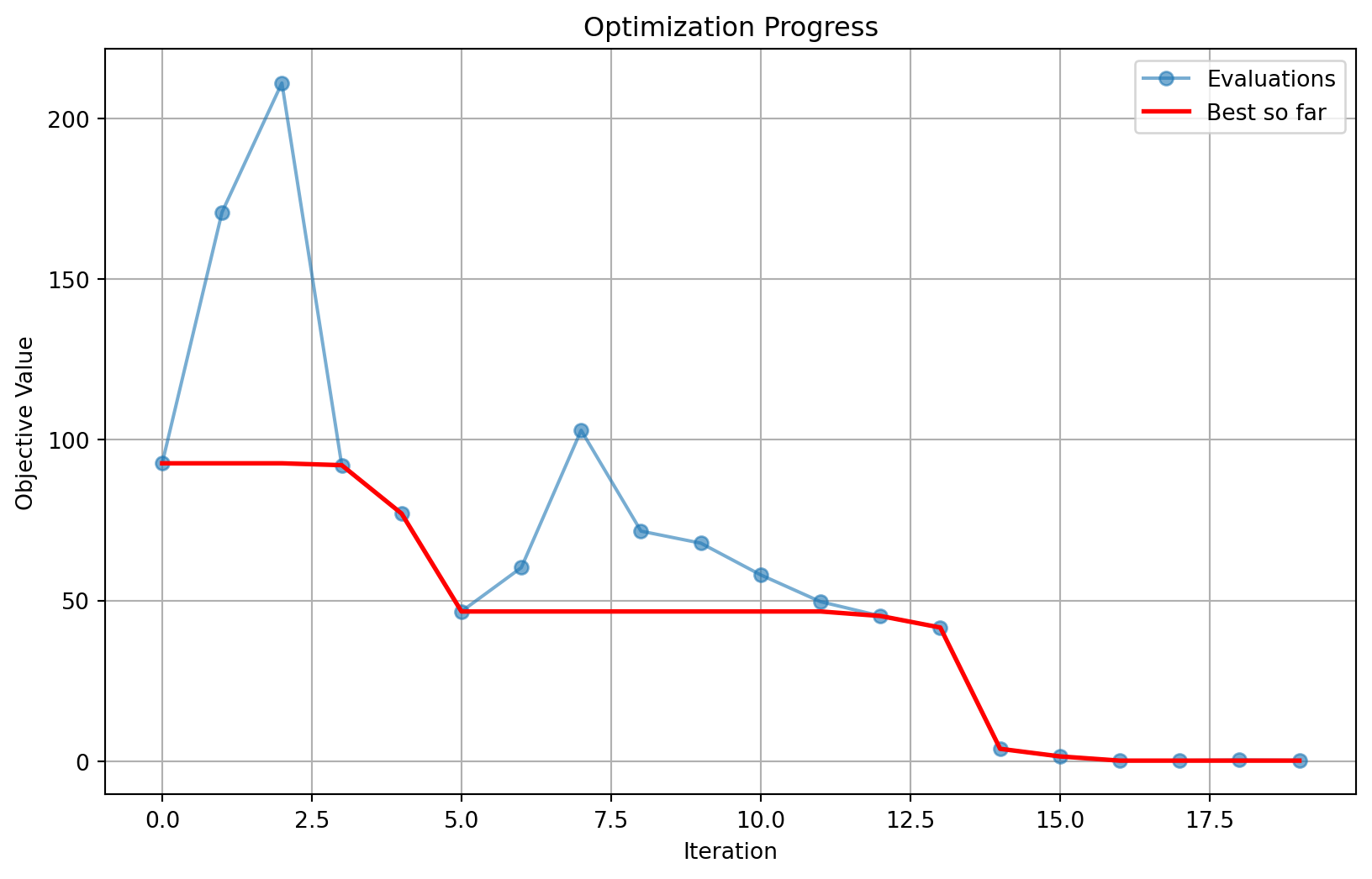 from spotoptim import SpotOptimimport matplotlib.pyplot as plt# Load results from remote executionoptimizer = SpotOptim.load_result("remote_job_001_res.pkl")# Access all optimization dataprint(f"Best value found: {optimizer.best_y_:.6f}")print(f"Best point: {optimizer.best_x_}")print(f"Total evaluations: {optimizer.counter}")print(f"Number of iterations: {optimizer.n_iter_}")# Analyze convergenceplt.figure(figsize=(10, 6))plt.plot(optimizer.y_, 'o-', alpha=0.6, label='Evaluations')plt.plot(range(len(optimizer.y_)), [optimizer.y_[:i+1].min() for i inrange(len(optimizer.y_))],'r-', linewidth=2, label='Best so far')plt.xlabel('Iteration')plt.ylabel('Objective Value')plt.title('Optimization Progress')plt.legend()plt.grid(True)plt.show()# Access all evaluated pointsprint(f"\nAll evaluated points shape: {optimizer.X_.shape}")print(f"All objective values shape: {optimizer.y_.shape}")