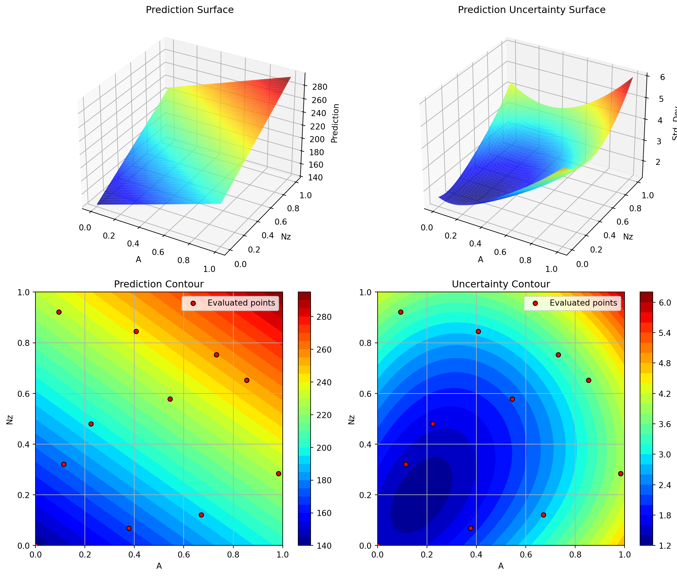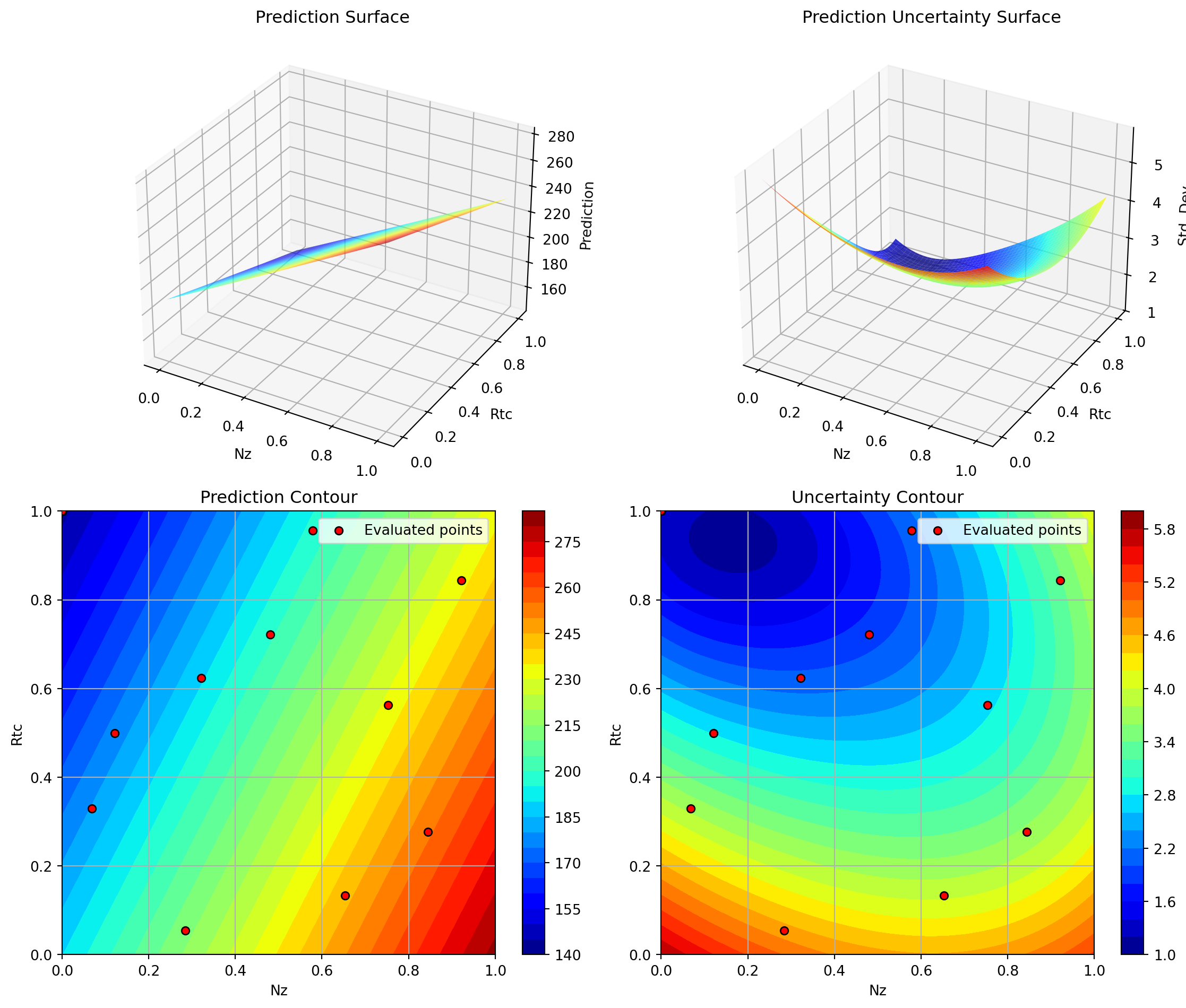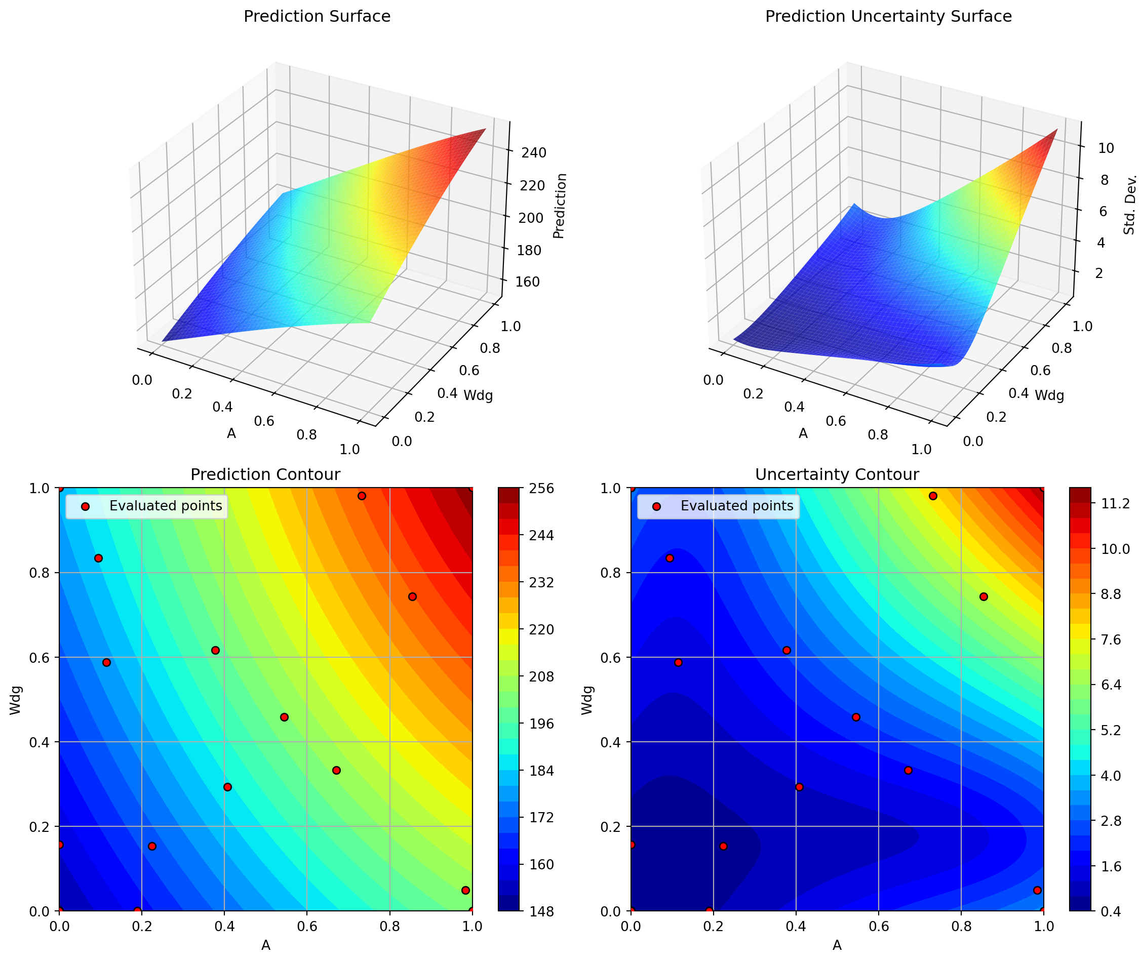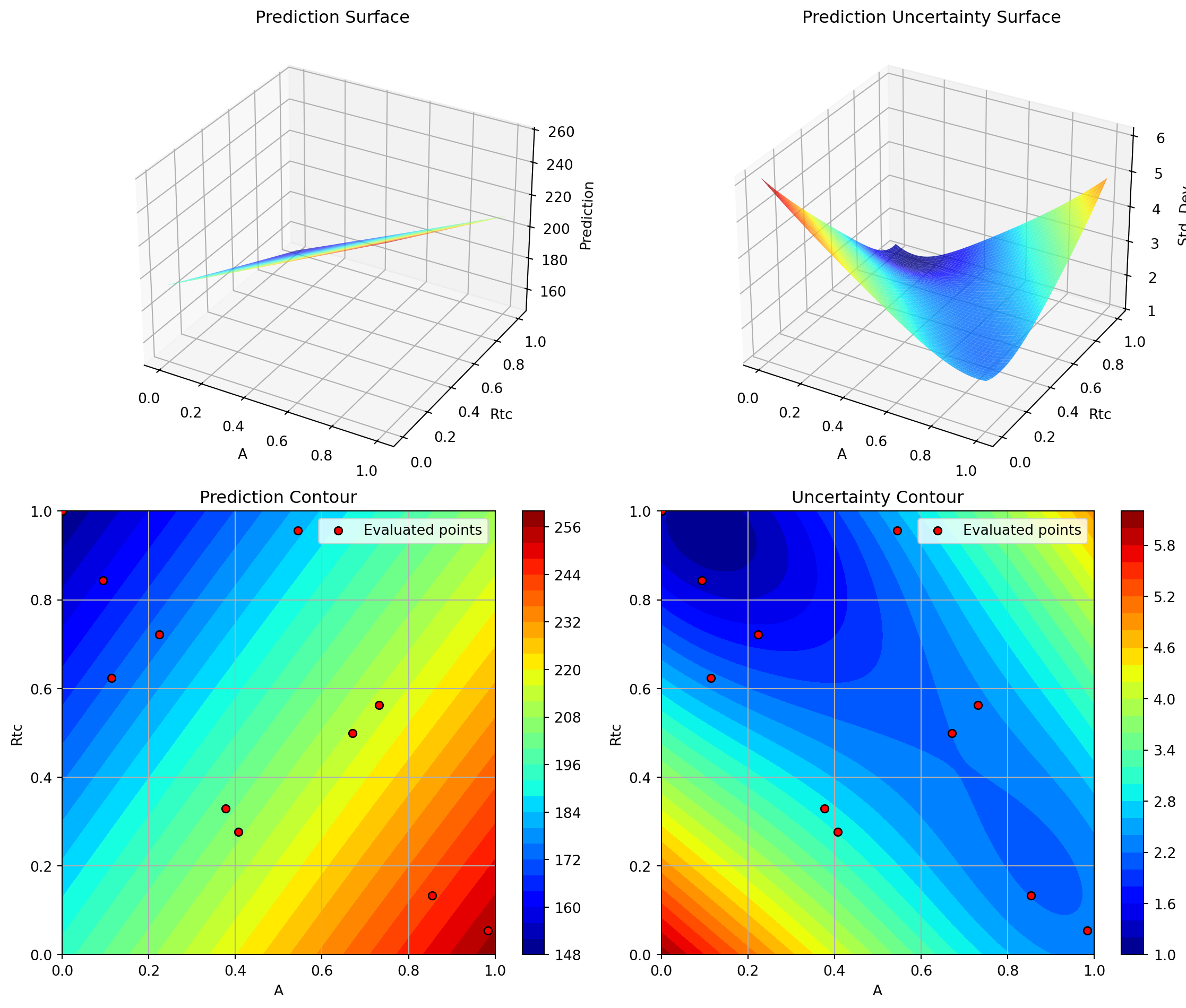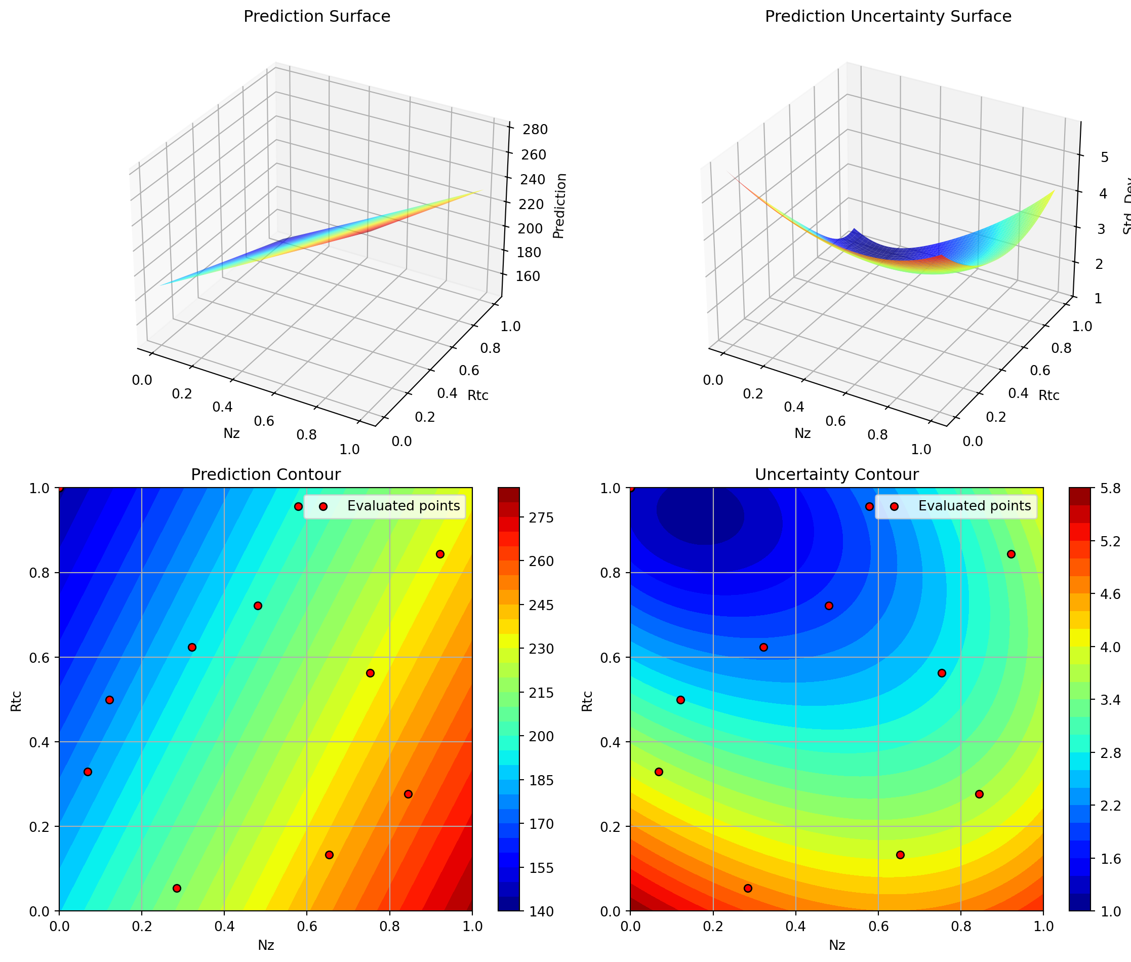 - Kriging: Similar to GP but with customizable correlation functions. Supports EI acquisition.