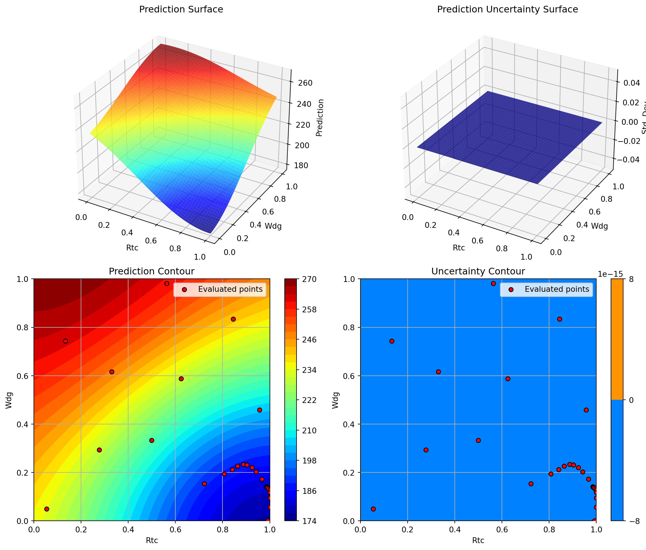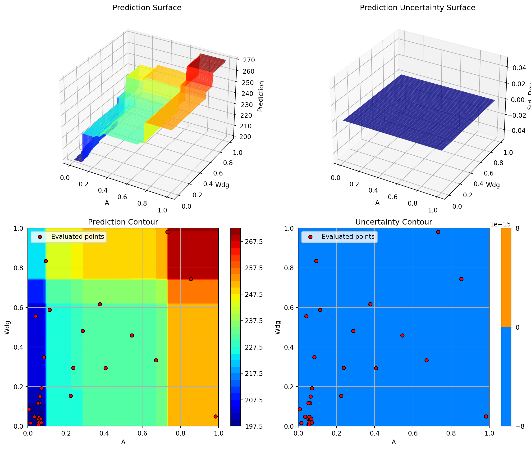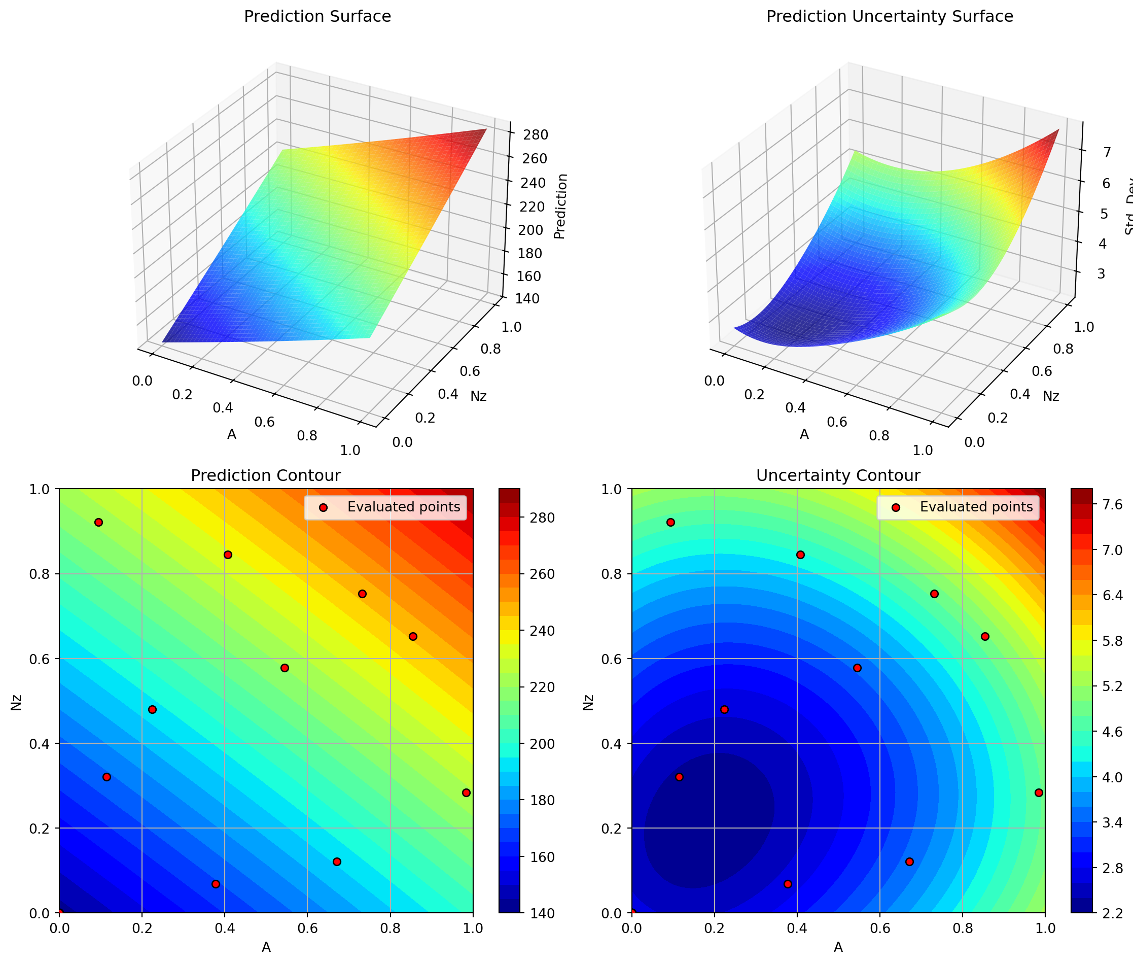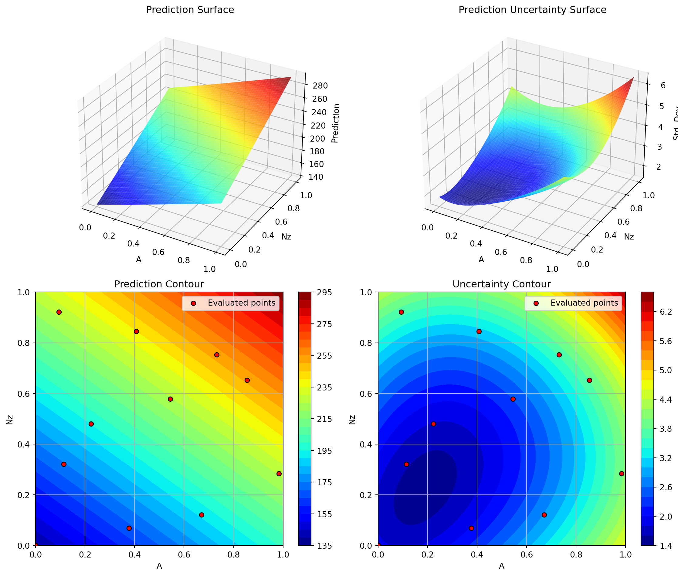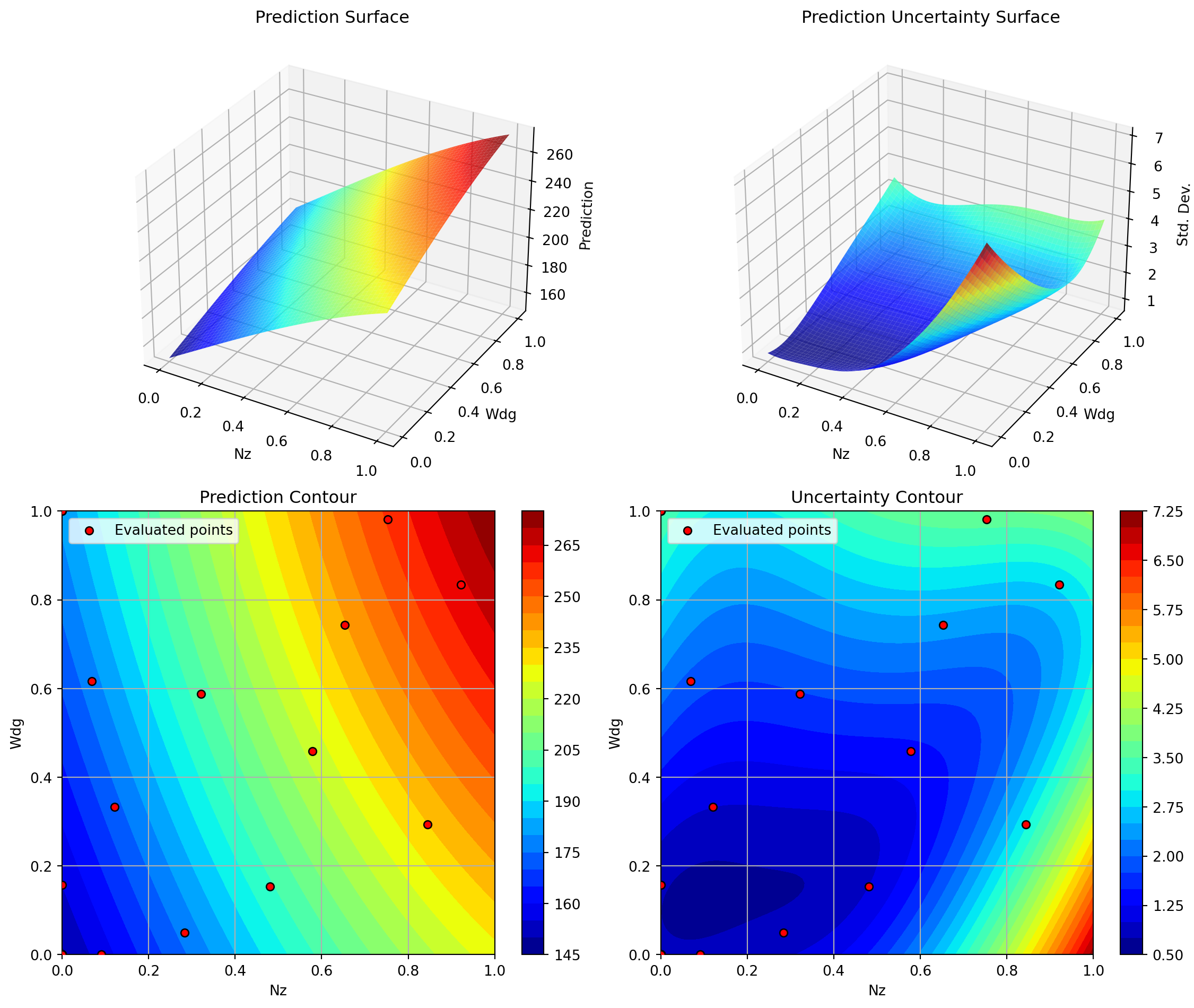 - Kriging: Similar to GP but with customizable correlation functions. Supports EI acquisition.