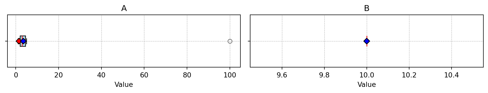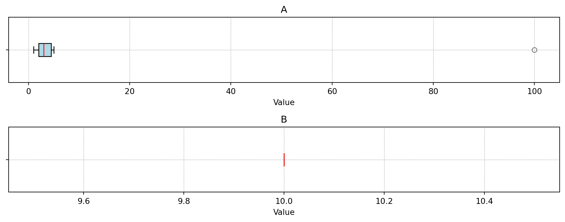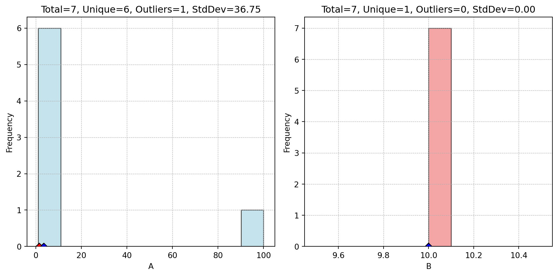 data = {'A': [1, 2, 2, 3, 4, 5, 100], 'B': [10, 10, 10, 10, 10, 10, 10]}