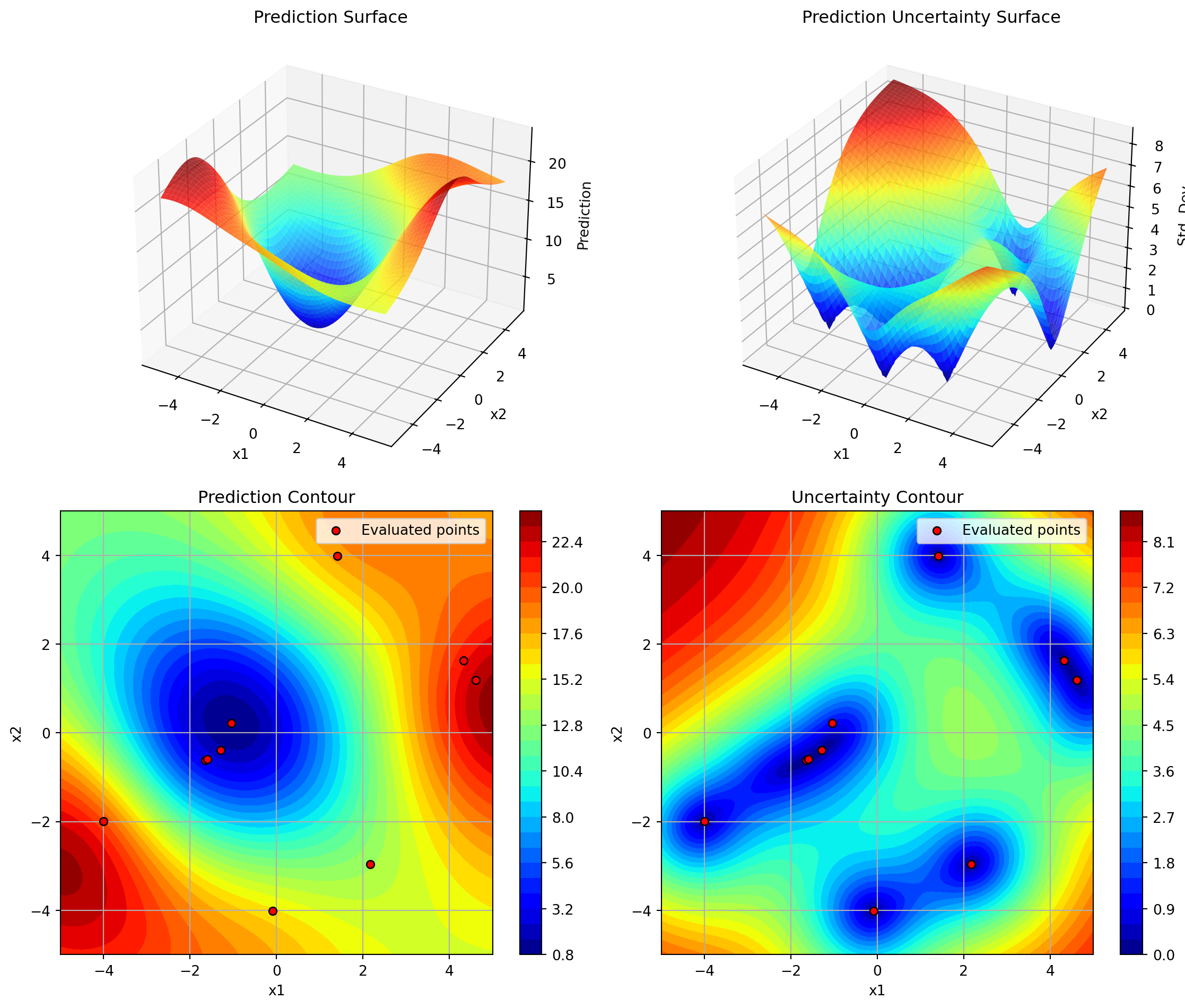 Creates a 2x2 plot showing: - Top left: 3D surface of predictions - Top right: 3D surface of prediction uncertainty - Bottom left: Contour plot of predictions with evaluated points - Bottom right: Contour plot of prediction uncertainty
