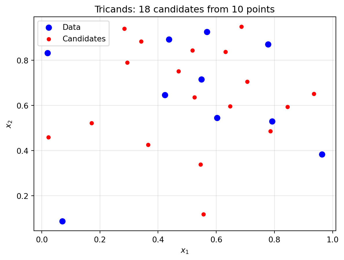 The tricands module generates candidate points for infill by computing the Delaunay triangulation of the existing evaluated points. This provides a geometry-aware alternative to global optimizers like differential evolution for maximizing the acquisition function.